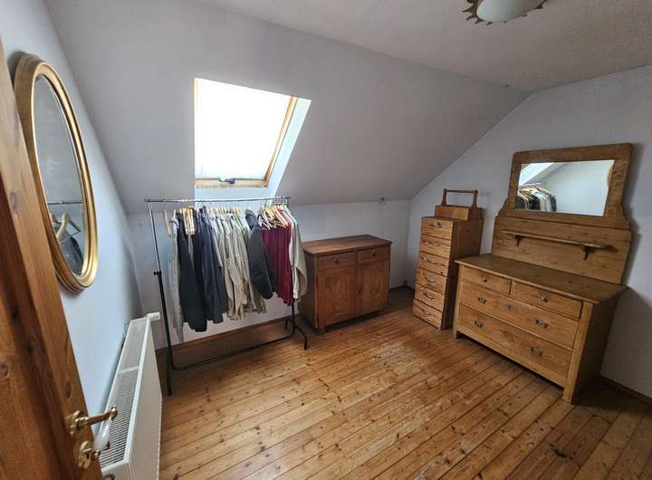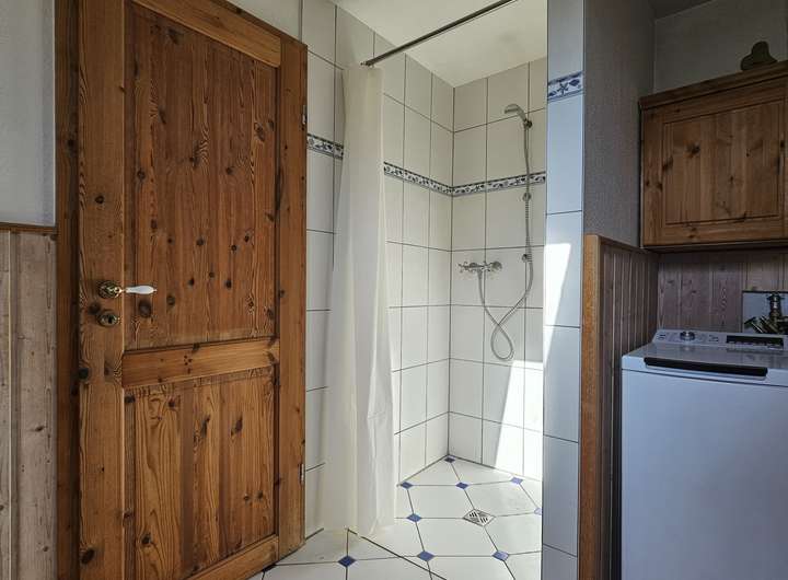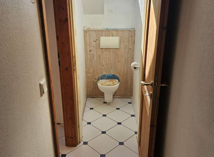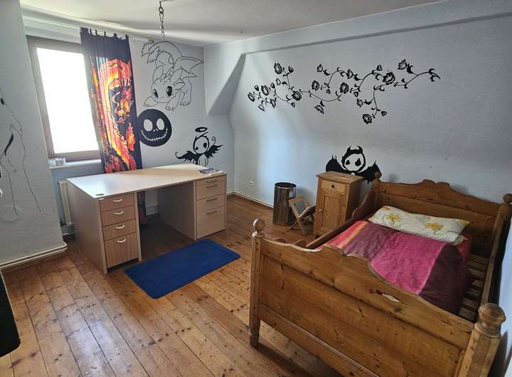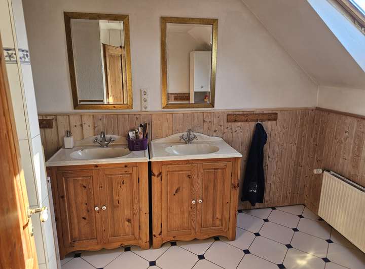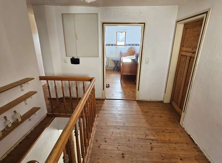 In 6 Zimmern und im Flur OG Holzfußboden (Landhausdielen), in Küche, Flur EG und Bad Fliesen.
