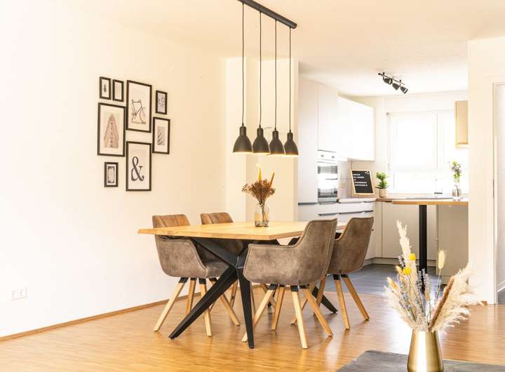 Die Fußböden in den Wohnräumen werden mit Parkett belegt, in den Nassräumen kommen großformatige Fliesen zum Einsatz.