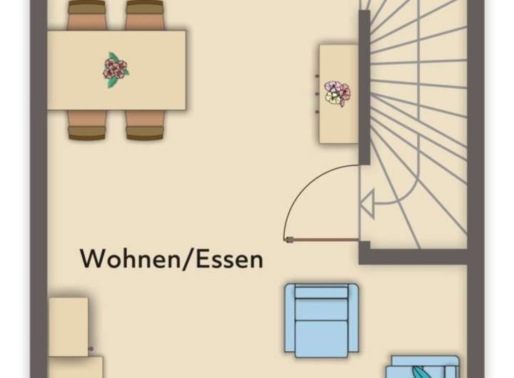 Im Erdgeschoß befinden sich das Wohnzimmer, die Küche, der Flur, das Gäste-WC sowie die Küche.