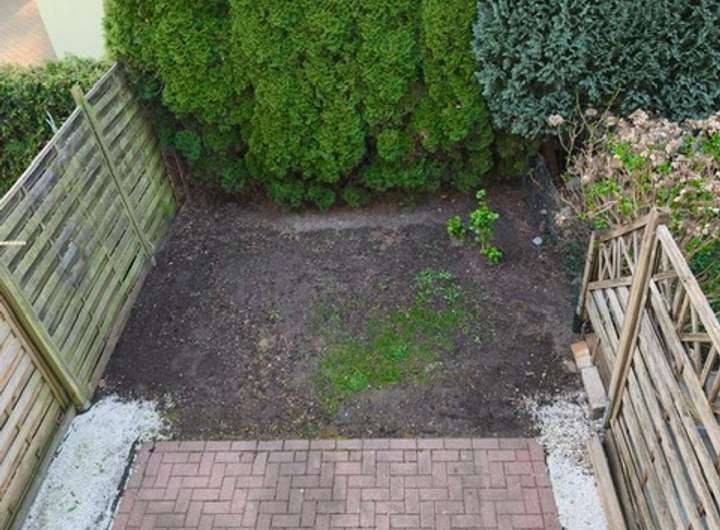 Der pflegeleichte Garten ist durch Trennwände und Bepflanzungen zu den Nachbarn sichtgeschützt.