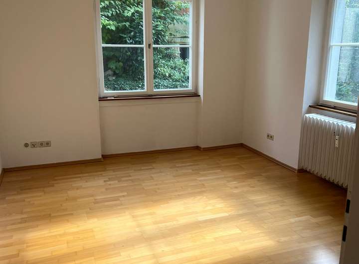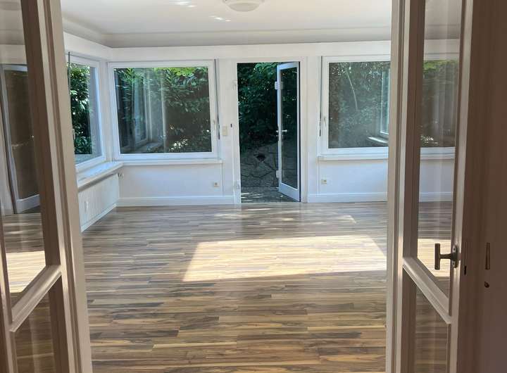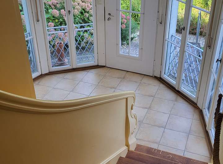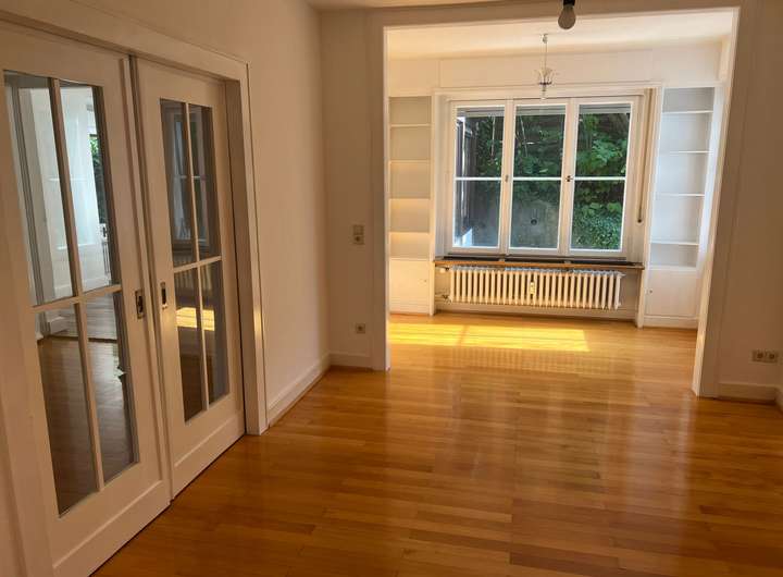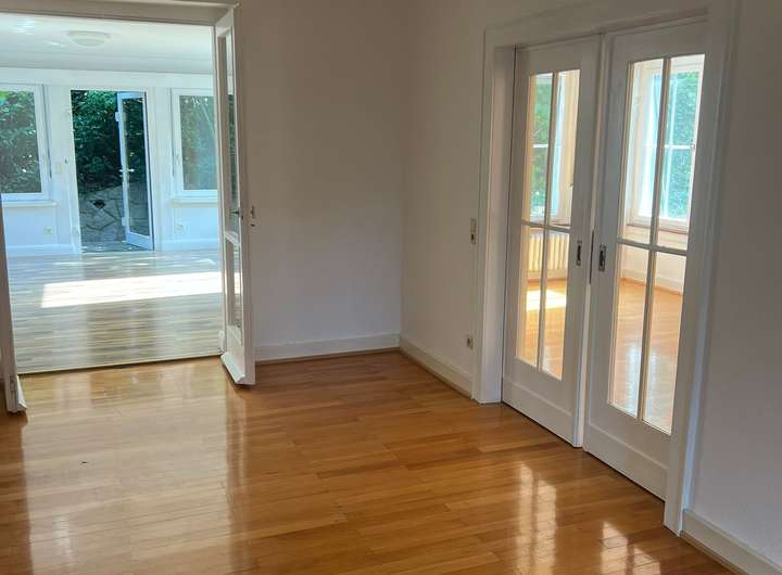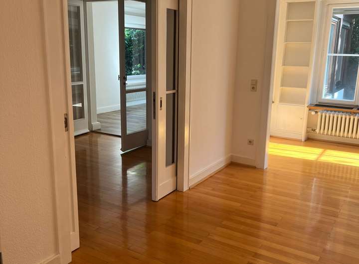 Im Erdgeschoss erwarten Sie ca. 160 m² und 6 Zimmer, die durch originales Parkett, historische Glastüren und ein lichtdurchflutetes Atelier mit Gartenzugang geprägt sind. Von hier führt der Weg auf eine große, halb überdachte, geflieste Terrasse mit herrlichem Schwarzwaldblick.