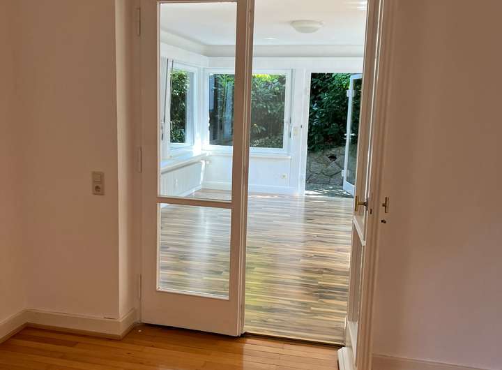 Originales Parkett, historische Glasschiebetüren und Flügeltüren, großzügige Tageslichtbäder, ein lichtdurchflutetes Atelier mit Gartenzugang, zwei große Terrassen, Balkone im Ober- und Dachgeschoss, angelegter Garten mit Rosen und Hortensien sowie praktische Einbauschränke im Flur.