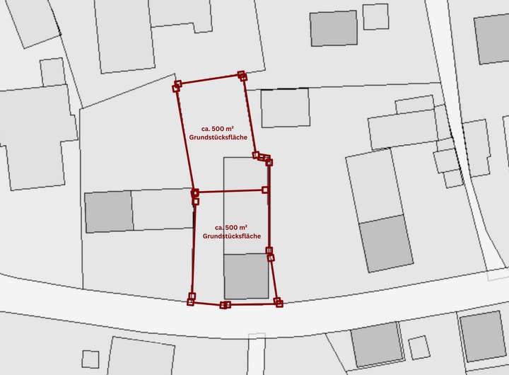 Im beigefügten Lageplan sind die beiden Grundstücksteile mit einer Trennlinie markiert. Bitte beachten Sie, dass dies nur eine Orientierung darstellt und die tatsächliche Teilung abweichen kann. Eine Haftung für die Richtigkeit der Markierung wird ausgeschlossen.