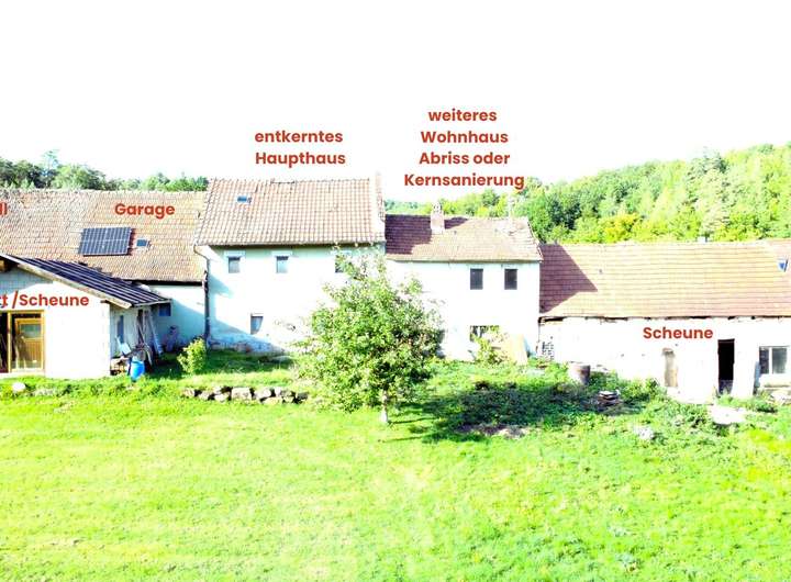 Zum Anwesen gehören außerdem mehrere Nebengebäude: eine große massive Fachwerkscheune in passablem Zustand, eine zweite massive Scheune in deutlich neuerem Zustand (als Werkstatt etc. nutzbar), eine Stalleinheit die als Lagerfläche dient, sowie eine Garage. Die Gebäude sind vielseitig nutzbar – ob als Werkstatt, Gewerbe, Lager, für handwerkliche Tätigkeiten, als Atelier oder für Tierhaltung.