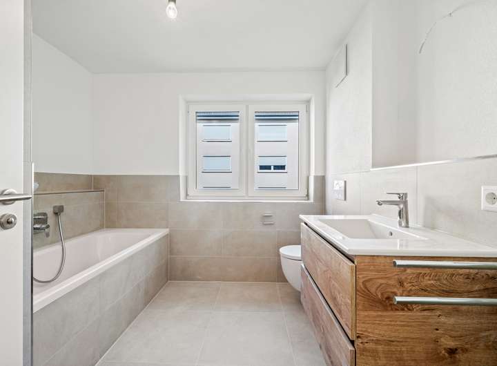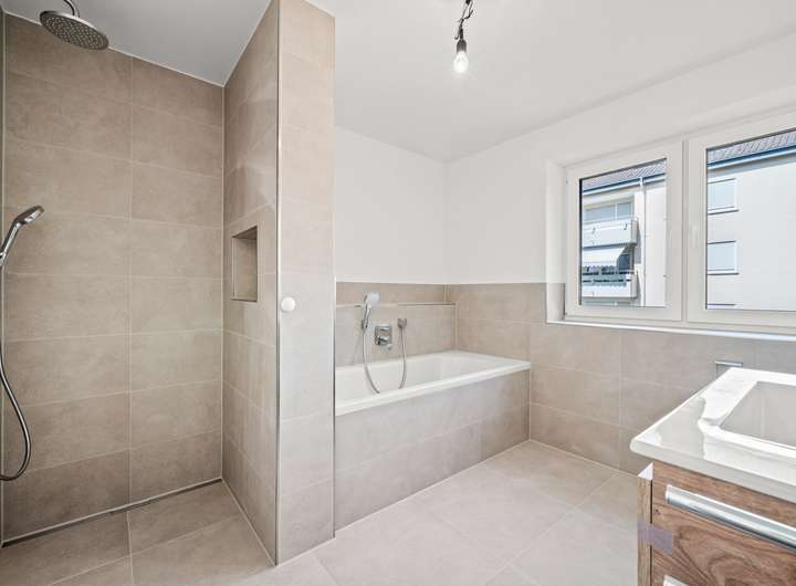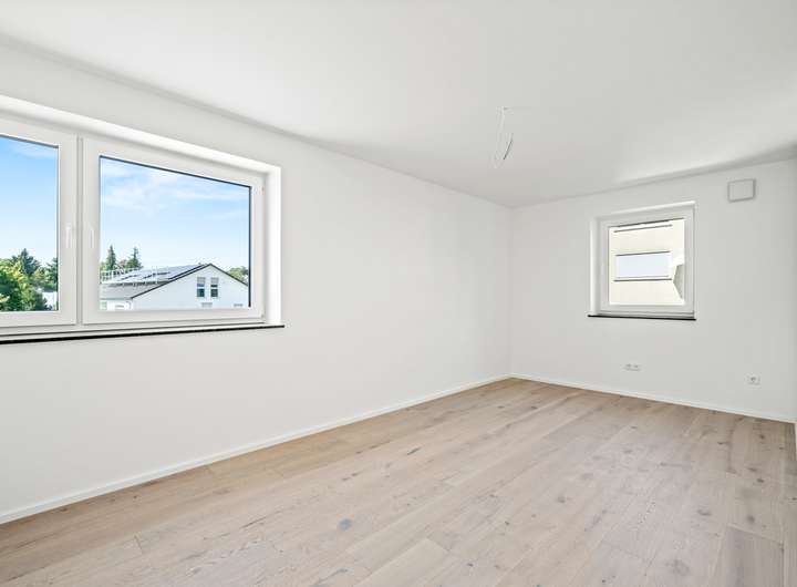 Die Ausstattung entspricht dem KfW-55-Standard und kombiniert Nachhaltigkeit mit Wohnkomfort. Eine Wärmepumpe, Photovoltaikanlage, Fußbodenheizung und eine dezentrale Lüftung mit Wärmerückgewinnung sorgen für niedrige Betriebskosten und ein angenehmes Raumklima. Hochwertige Materialien wie Eichenparkett, moderne Sanitärobjekte und bodentiefe Fenster runden den hochwertigen Eindruck ab.