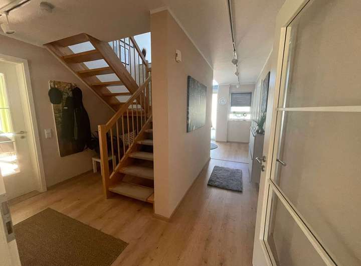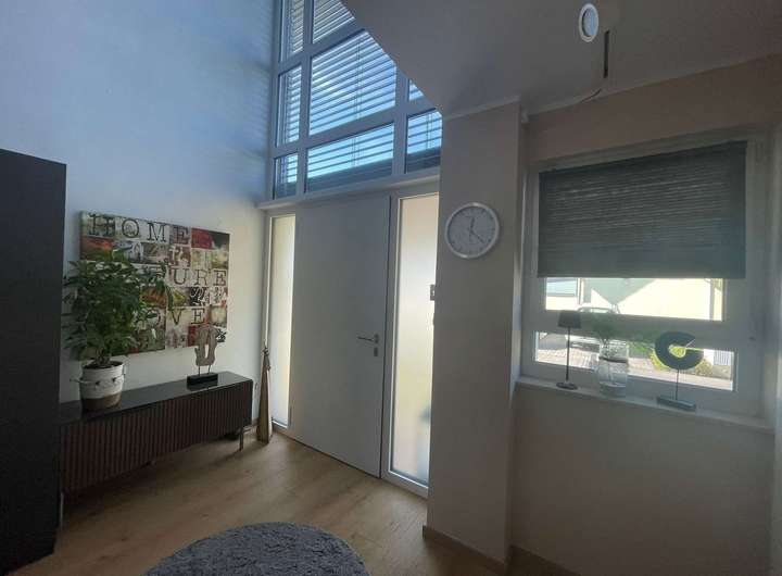 Bereits beim Betreten des Hauses empfängt Sie ein großzügiger und heller Eingangsbereich mit offenem Erker und stilvoller Natursteinwand. Die moderne Hauseingangstür lässt sich bequem per Fingerabdruck öffnen und verbindet damit Sicherheit und Komfort auf zeitgemäße Weise. Dieser einladende Flur führt Sie direkt in die Hauptbereiche des Hauses und vermittelt sofort ein Gefühl von Großzügigkeit und Eleganz. Im Erdgeschoss befinden sich ein Gäste-WC, eine offene Küche, der Essbereich, das Wohnzimmer sowie ein weiteres Zimmer, das derzeit als Büro genutzt wird. Vom Wohnbereich aus gelangen Sie auf die überdachte Terrasse, die den Zugang zum Garten und zur Garage bietet.