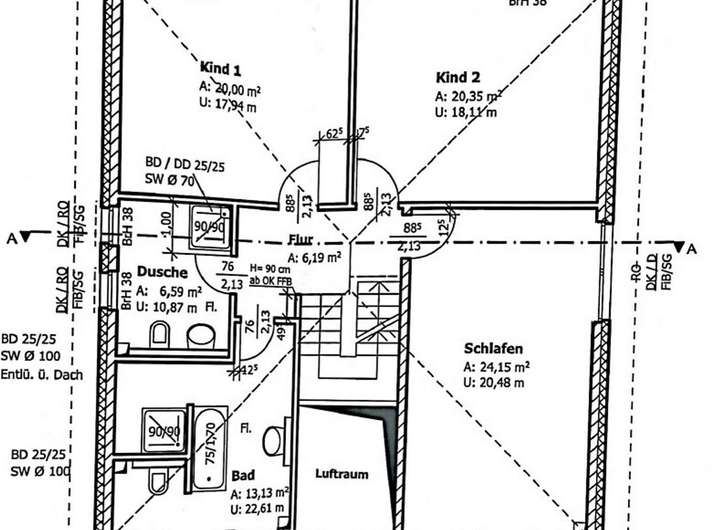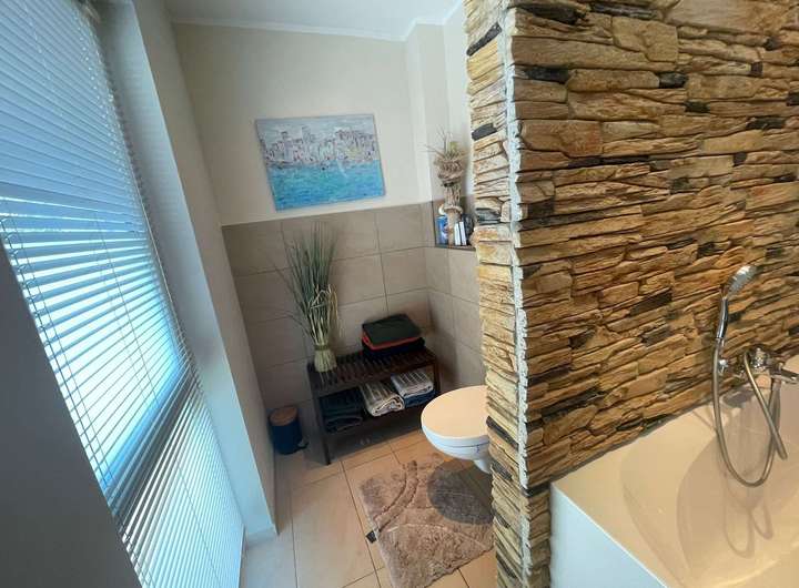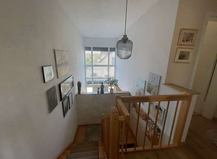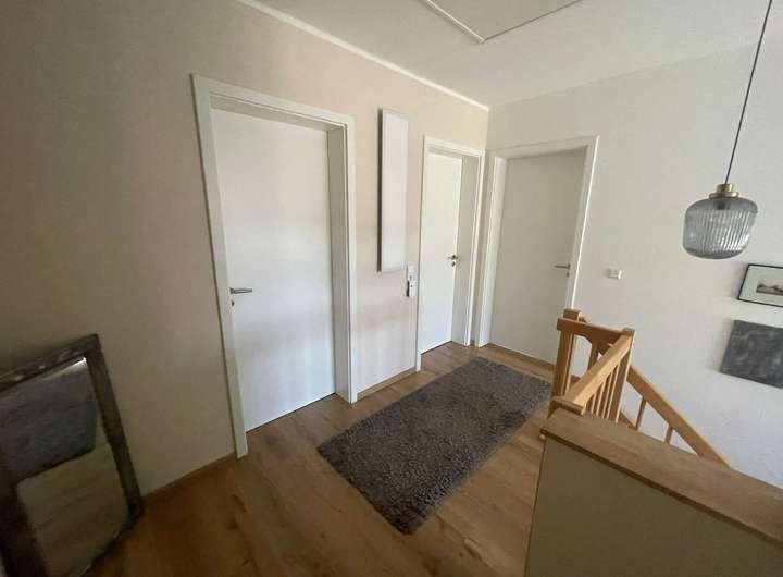 Über eine moderne, offene Treppe erreichen Sie das Obergeschoss. Große Fenster sorgen auch hier für Helligkeit und ein freundliches Ambiente. Im Obergeschoss befinden sich drei Zimmer sowie ein großes Badezimmer, das mit Naturstein gestaltet ist. Eine Badewanne und eine bodentiefe Dusche laden zum Entspannen ein und geben dem Raum einen Hauch von Wellness.