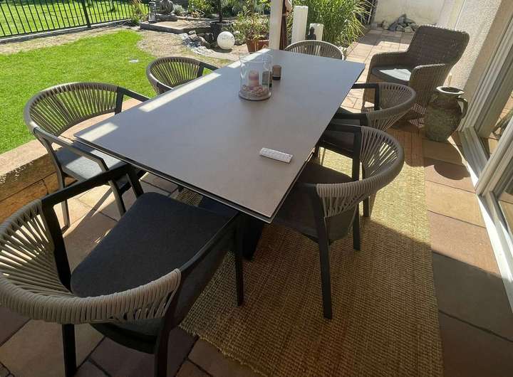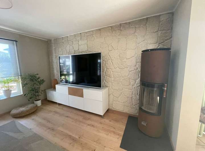 Der Wohn- und Essbereich ist lichtdurchflutet und wirkt durch bodentiefe Fenster besonders großzügig. Elektrische Rollläden, die sich bequem per Fernbedienung steuern lassen, sorgen für Komfort und Privatsphäre. Eine stilvolle Natursteinwand und ein Kamin mit Wärmespeicher schaffen eine behagliche Atmosphäre. Von hier aus betreten Sie die überdachte Terrasse und den liebevoll gestalteten Garten mit einem überdachten Loungebereich, der sich perfekt für entspannte Sommerabende und Grillfeste eignet.