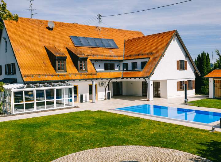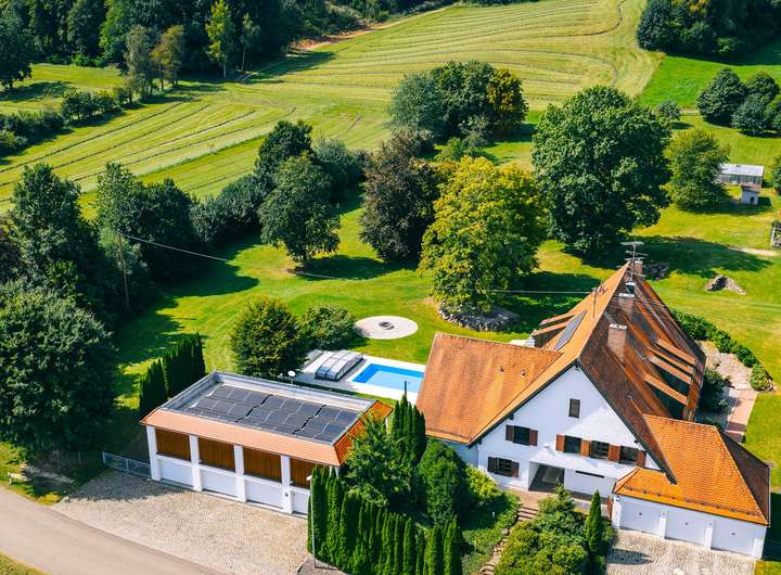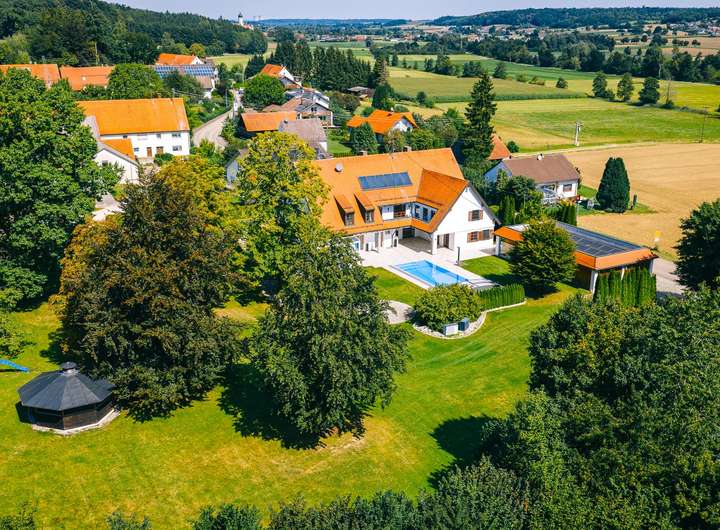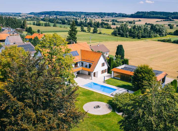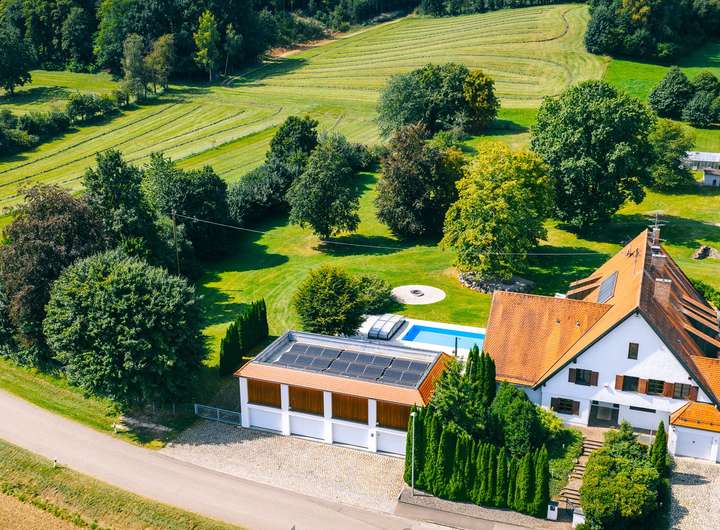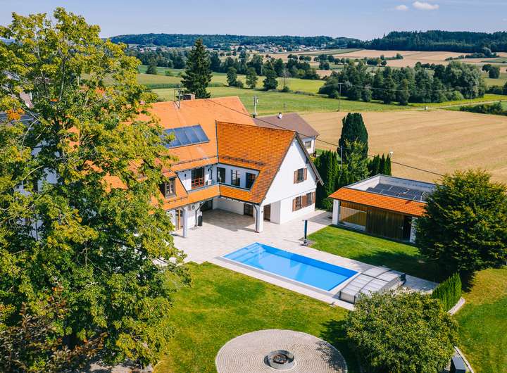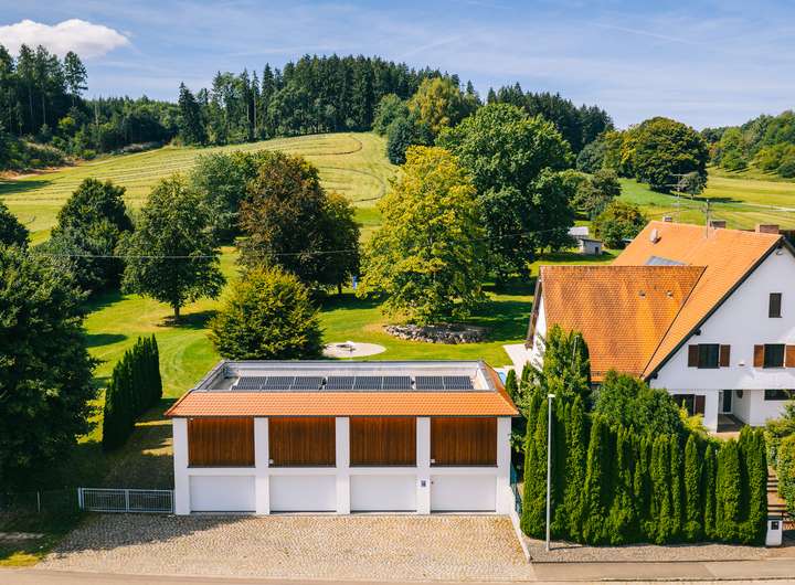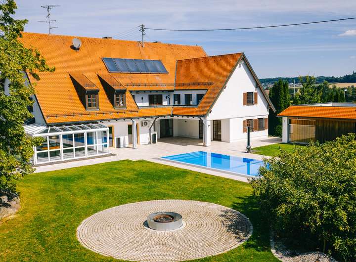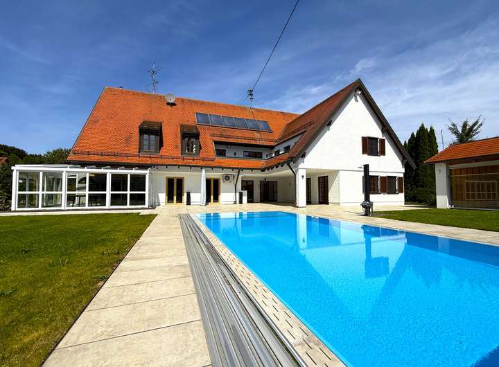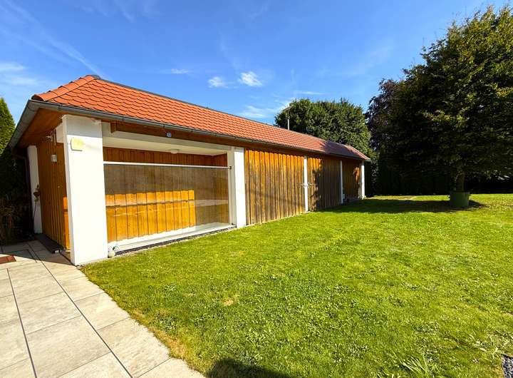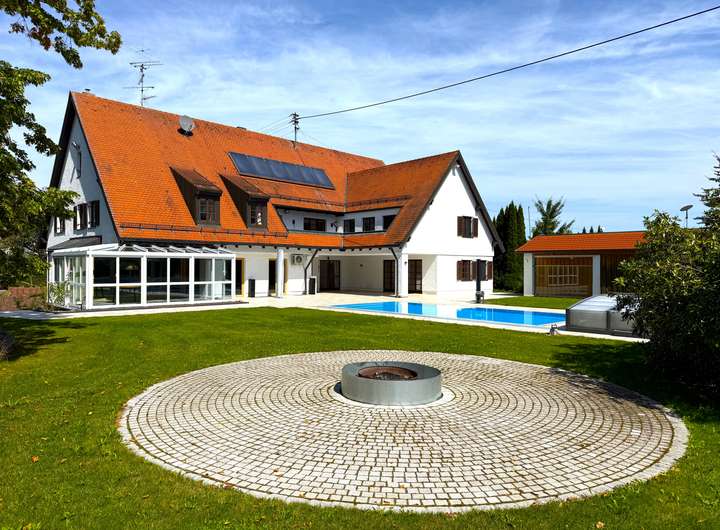 Auch der Außenbereich besticht durch seine Vielseitigkeit. Neben den angebauten Garagen steht eine separate Garage für bis zu vier Fahrzeuge zur Verfügung. Darüber befindet sich ein weiteres Geschoss mit rund 137 m², das sowohl als Geräteraum als auch für Veranstaltungen genutzt werden kann. Der parkähnliche Garten mit altem Baumbestand, Obstbäumen und idyllischen Lauben wird durch einen eigenen Brunnen versorgt, der sowohl die Gartenbewässerung als auch den Infinity-Pool mit moderner OSPA-Technik speist. Eine Grillhütte mit Wasser- und Stromanschluss lädt zu geselligen Stunden im Freien ein.