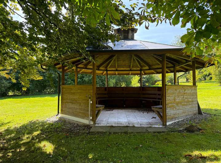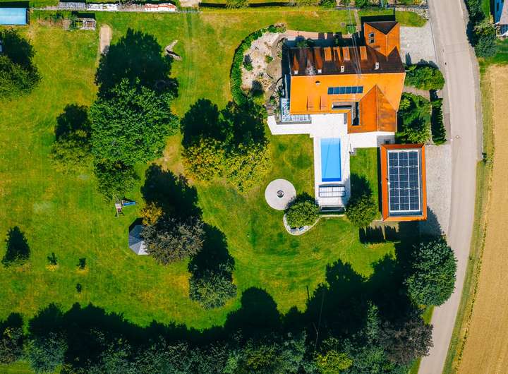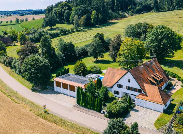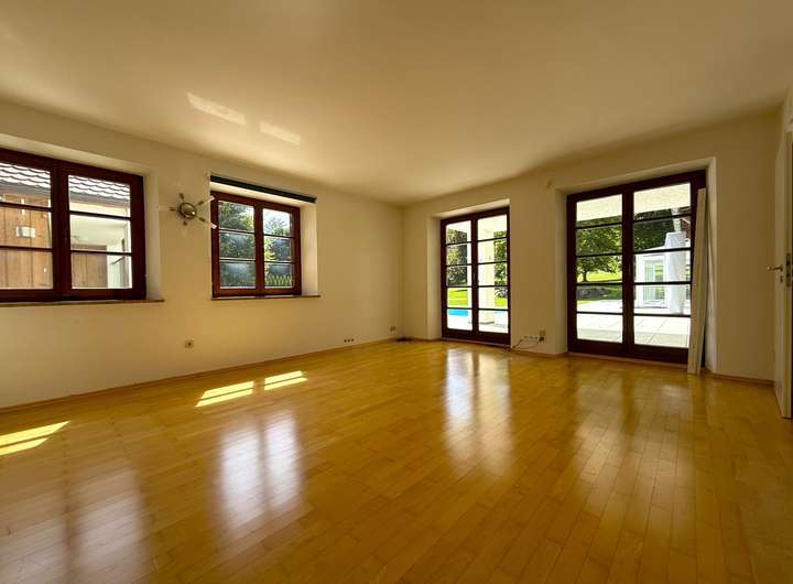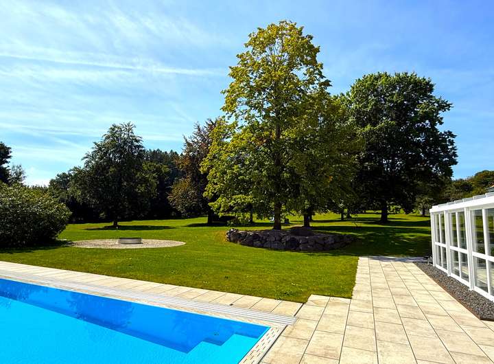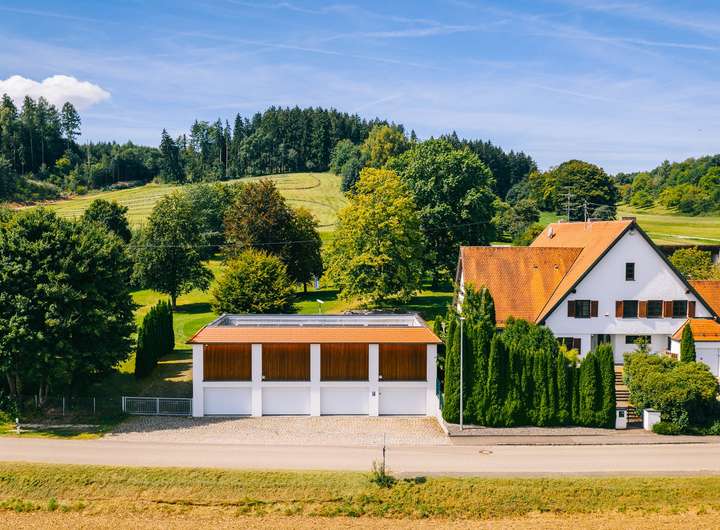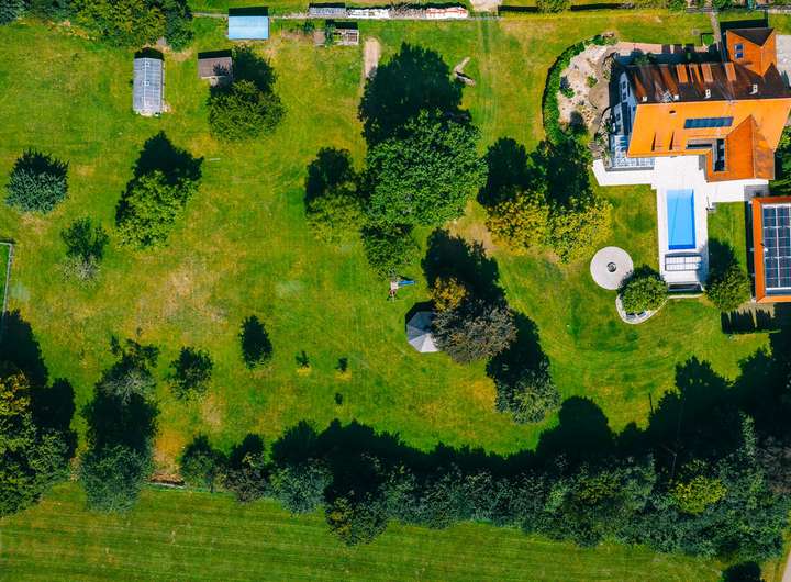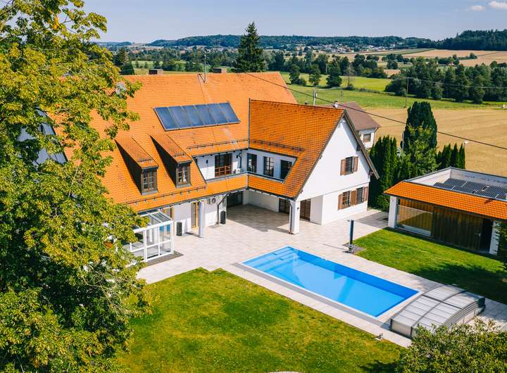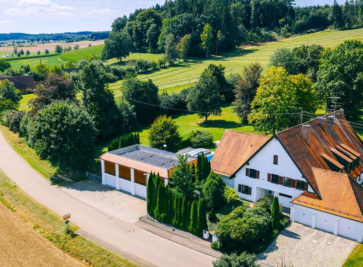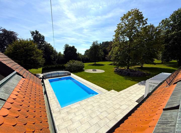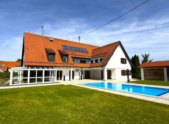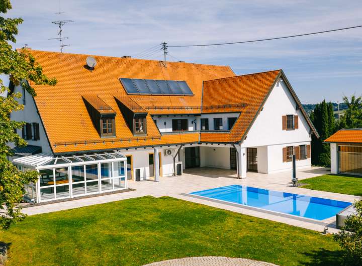 Auch der Außenbereich besticht durch seine Vielseitigkeit. Neben den angebauten Garagen steht eine separate Garage für bis zu vier Fahrzeuge zur Verfügung. Darüber befindet sich ein weiteres Geschoss mit rund 137 m², das sowohl als Geräteraum als auch für Veranstaltungen genutzt werden kann. Der parkähnliche Garten mit altem Baumbestand, Obstbäumen und idyllischen Lauben wird durch einen eigenen Brunnen versorgt, der sowohl die Gartenbewässerung als auch den Infinity-Pool mit moderner OSPA-Technik speist. Eine Grillhütte mit Wasser- und Stromanschluss lädt zu geselligen Stunden im Freien ein.