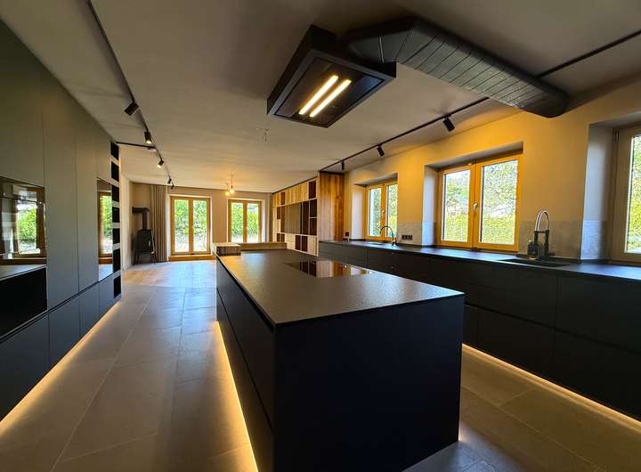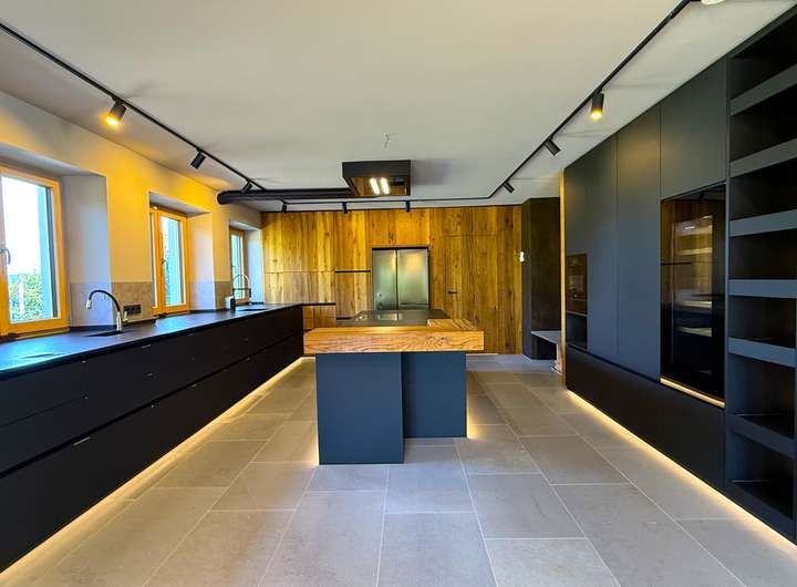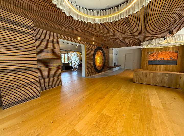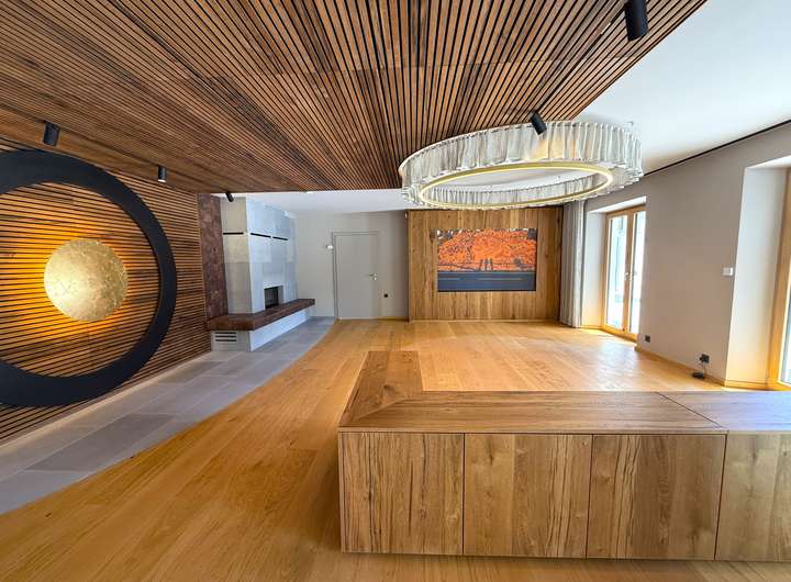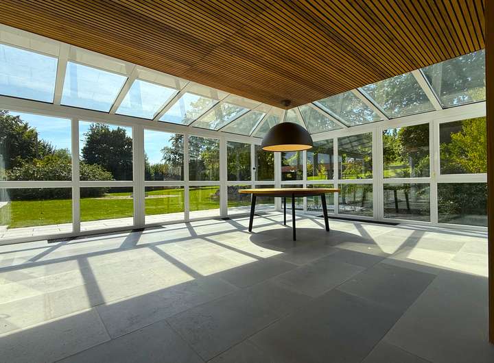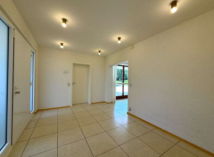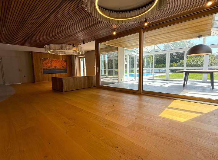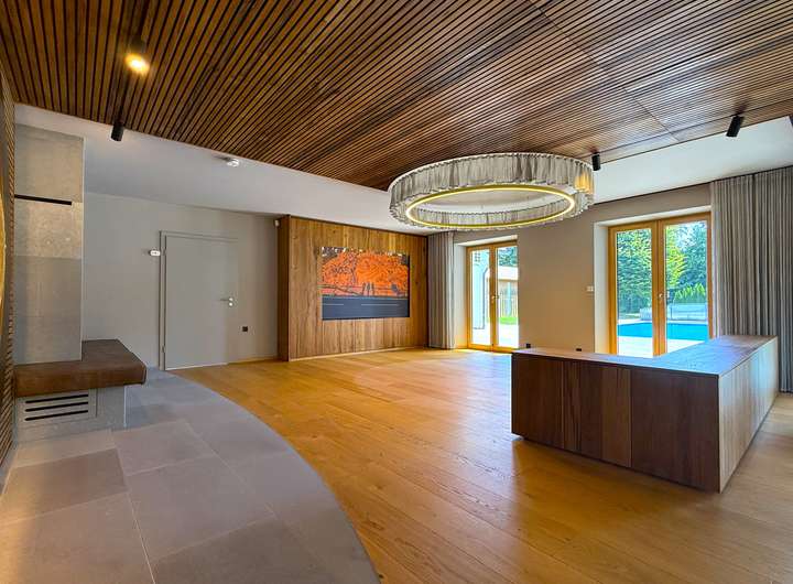Im Erdgeschoss eröffnet sich eine klare und großzügige Raumstruktur. Ein separater Gäste- oder Arbeitsbereich mit zwei Zimmern, eigenem WC sowie Lager- und Hauswirtschaftsraum bietet vielseitige Nutzungsmöglichkeiten. Die stilvolle Hauptküche mit angrenzender Vorbereitungsküche fügt sich harmonisch in den Essbereich ein. Das Wohnzimmer mit seinem Kamin, der auch von der Küche aus sichtbar bleibt, bildet das Herzstück des Hauses. Ein klimatisierter Wintergarten erweitert den Wohnraum und schafft einen lichtdurchfluteten Übergang ins Freie. Von hier wie auch vom Wohnzimmer gelangt man auf die Terrasse, zur Loggia am Pool und in den weitläufigen Garten – stets begleitet von einem herrlichen Blick über das Anwesen.