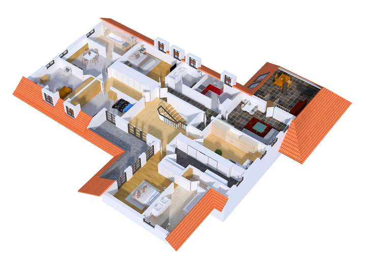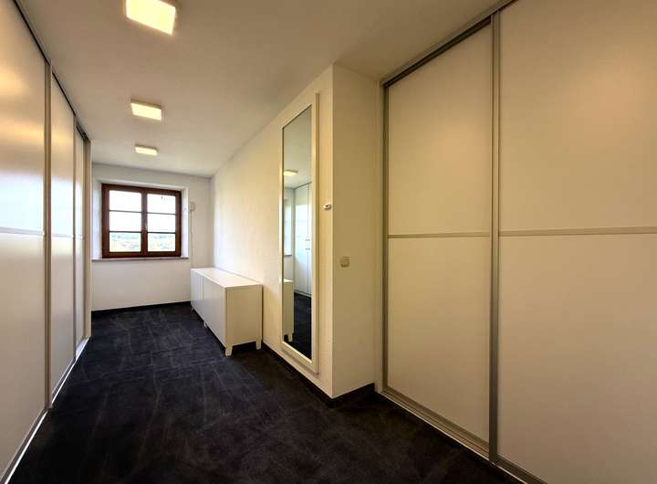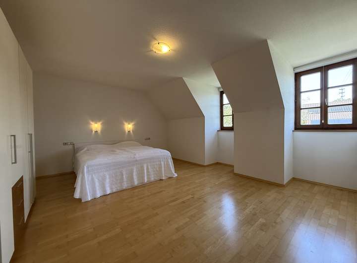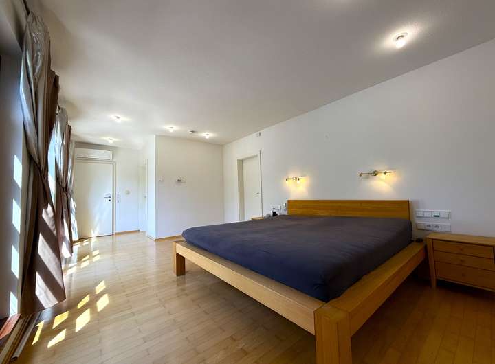 Das Dachgeschoss gliedert sich in drei Bereiche: Der Elterntrakt umfasst ein elegantes Schlafzimmer, ein großzügiges Bad, einen begehbaren Kleiderschrank sowie ein zusätzliches Büro. Der Kinderbereich bietet zwei Schlafzimmer, ein gemeinsames Wohnzimmer und ein eigenes Bad. Für Gäste steht eine vollständig abgeschlossene Einliegerwohnung mit rund 95 m² zur Verfügung – ausgestattet mit drei Zimmern, Bad, Küche und Abstellraum. Von der zentral gelegenen Diele eröffnet sich zudem ein Balkon mit eindrucksvollem Blick über die Gartenanlage.