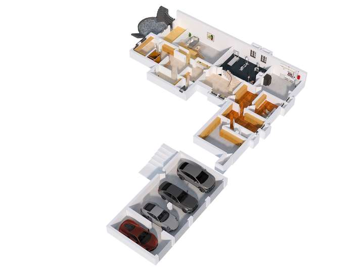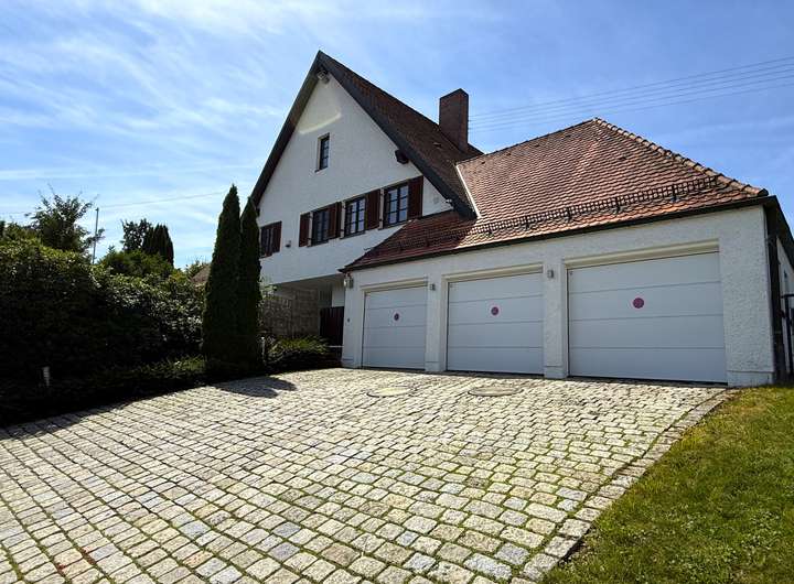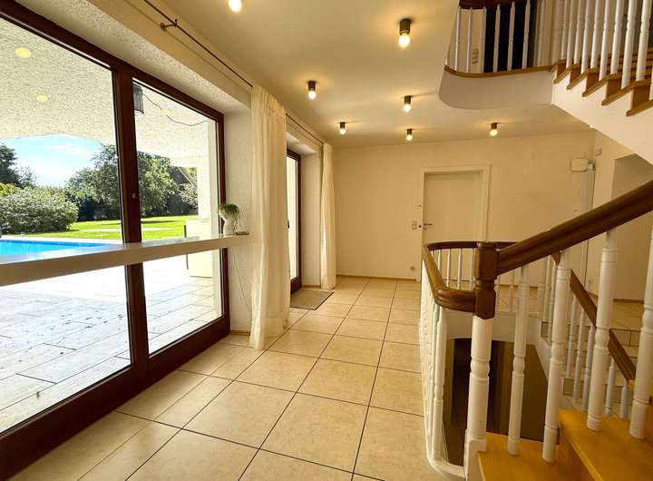 Schon von außen beeindruckt die Villa durch ihre elegante Architektur im Landhausstil und ihre repräsentative Ausstrahlung. Über den großzügigen Eingangsbereich mit geschickt integrierten Garderobennischen betritt man das Anwesen. Aus den drei angebauten Garagen führt ein direkter Zugang ins Haus – ein Detail, das Komfort und Funktionalität perfekt vereint.