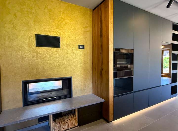 * Kaminofen im Wohnzimmer und in der Küche, Stückholzofen im Esszimmer