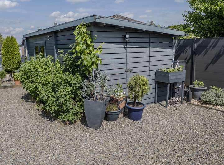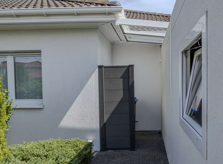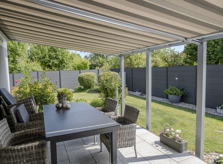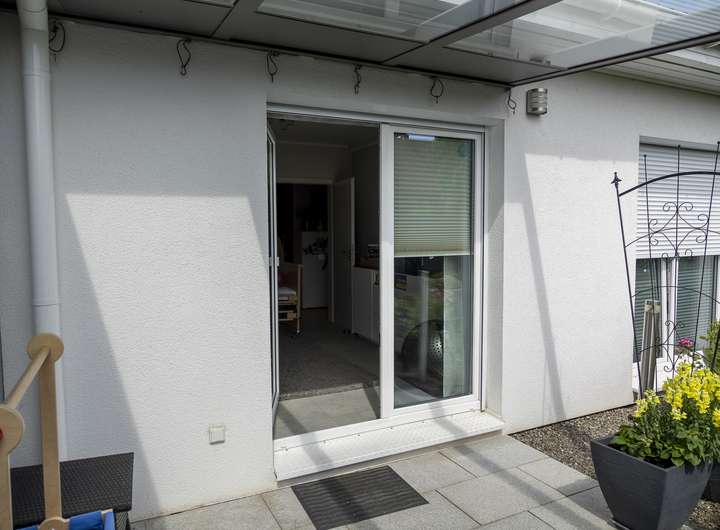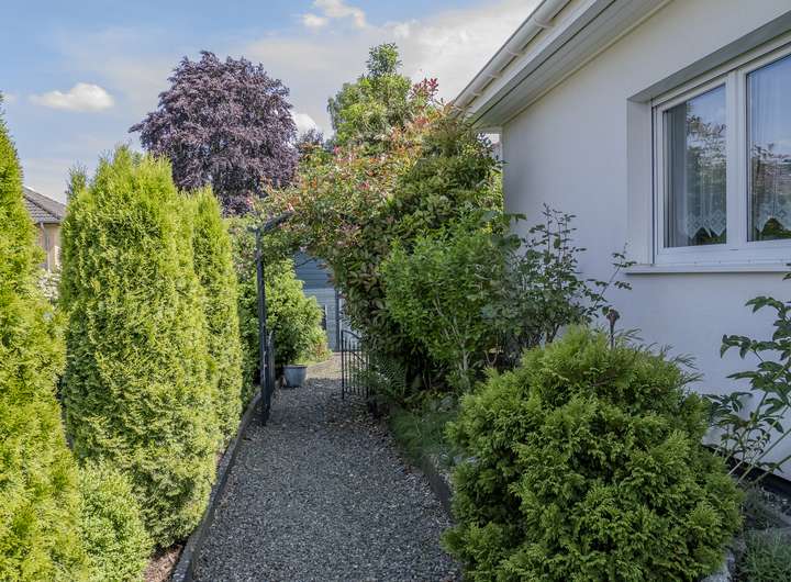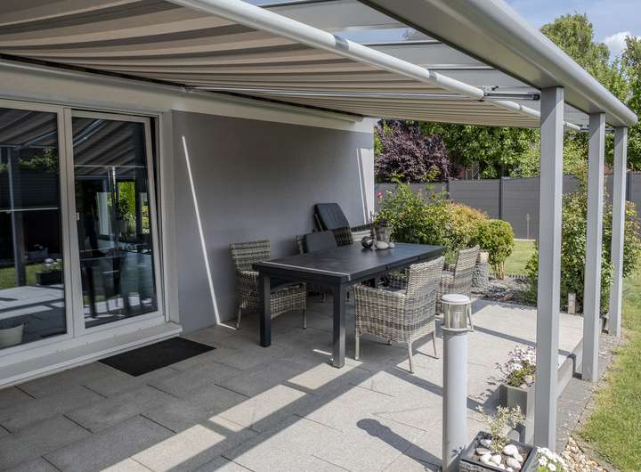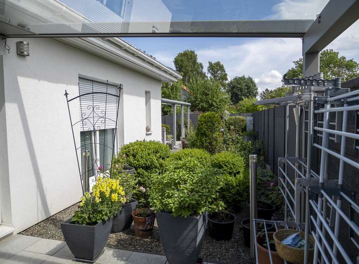 Ein weiteres Highlight ist die Glasüberdachung mit Markise über der Terrasse, die zum Verweilen einlädt. Der gepflegte Garten umgibt das Haus komplett, mit einer liebevoll angelegten Grünfläche sowohl vor als auch hinter dem Haus.