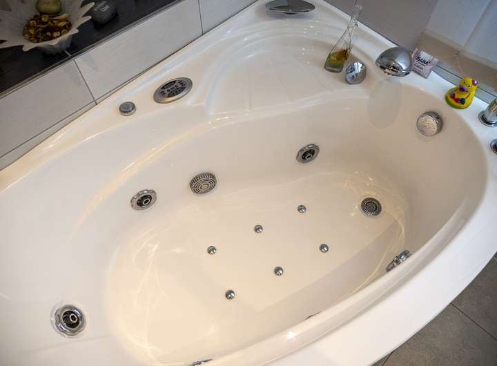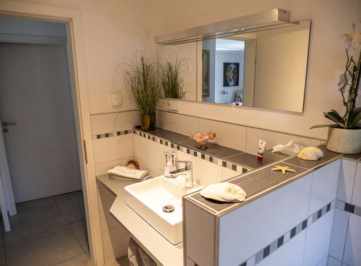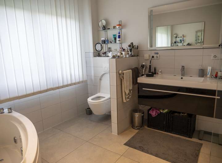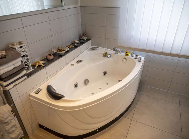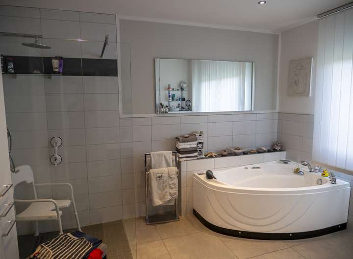 • Großzügiges Hauptbad mit bodengleicher Dusche, Whirlpoolwanne und gefliesten Wänden bis 1,50 m Höhe