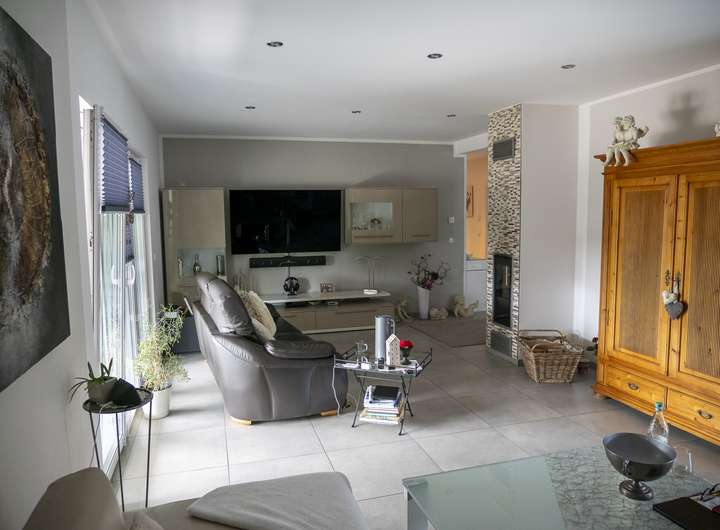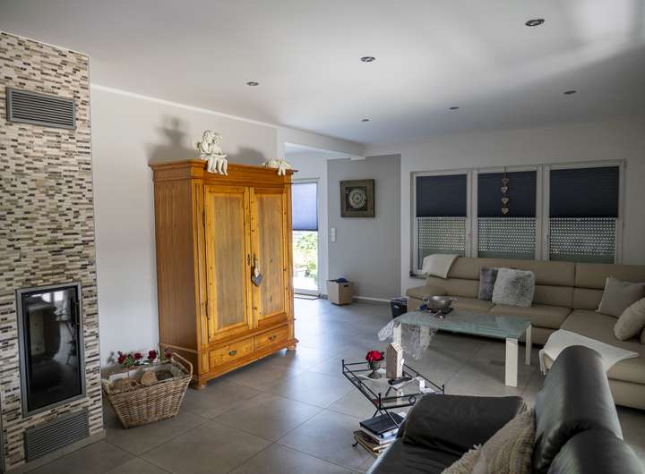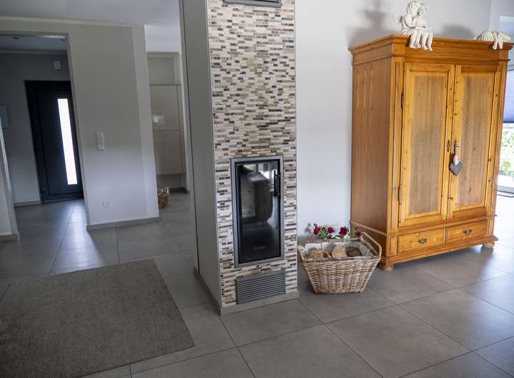 Das Haus entspricht dem KfW 55 Standard und wird umweltfreundlich über eine Erdwärmeanlage mit Flächenkollektoren (1,20 m Tiefe) beheizt. In Kombination mit einer Fußbodenheizung, die individuell über Raumthermostate gesteuert werden kann, bietet es ein behagliches Wohnklima. Ein Kamin im Wohnbereich sorgt an kalten Tagen für zusätzliche Gemütlichkeit. Das Haus wurde in einer umweltfreundlichen und innovativen Holzrahmenbauweise errichtet.