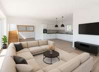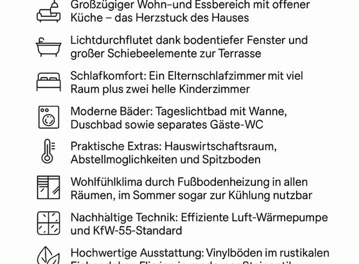 Die Ausstattung überzeugt mit Fußbodenheizung in allen Räumen, die im Sommer auch kühlen kann, dreifachverglasten Fenstern mit elektrischen Rollläden sowie hochwertigen Bodenbelägen: Vinyl im rustikalen Eichendekor und großformatige Fliesen in Steinoptik. Die großzügigen Schiebeelemente öffnen den Blick auf zwei sonnige Terrassen mit pflegeleichten WPC-Dielen – perfekt zum Entspannen und Genießen.