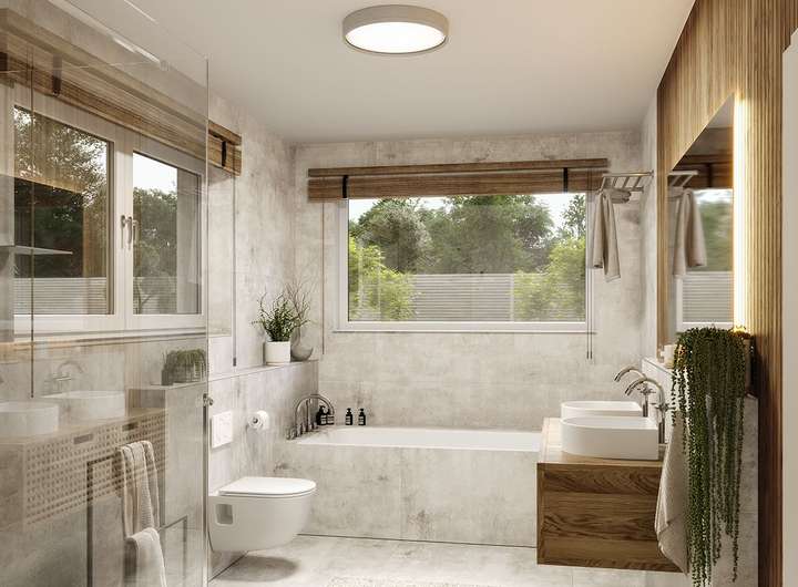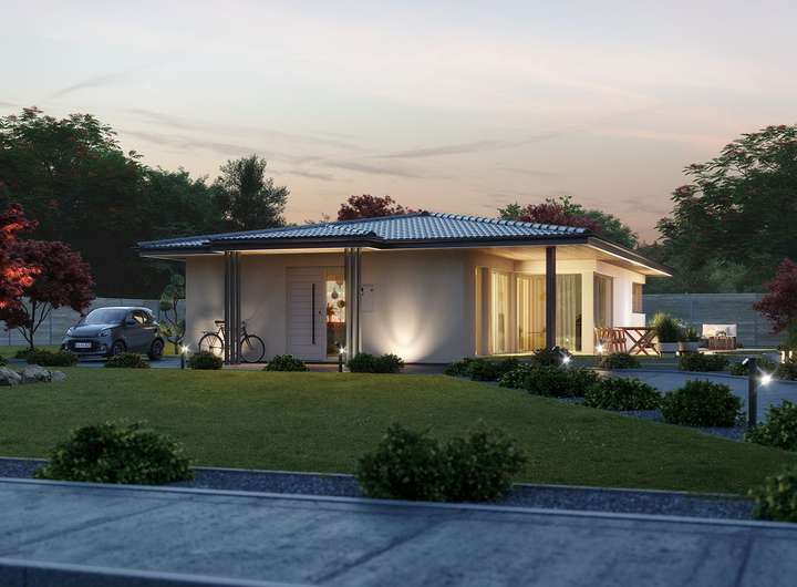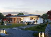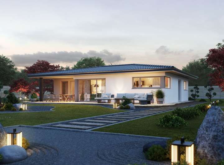 Das Binderdach und die klaren Linien des Bungalow-Stils verleihen diesem Haus ein zeitlos modernes Ambiente. Im Erdgeschoss erwartet Sie ein geräumiges Arbeitszimmer, eine moderne Küche und ein einladendes Wohnzimmer mit Essbereich. Hier können Sie Ihre Familie und Freunde zu gemütlichen Abenden einladen und gemeinsam schöne Momente genießen.