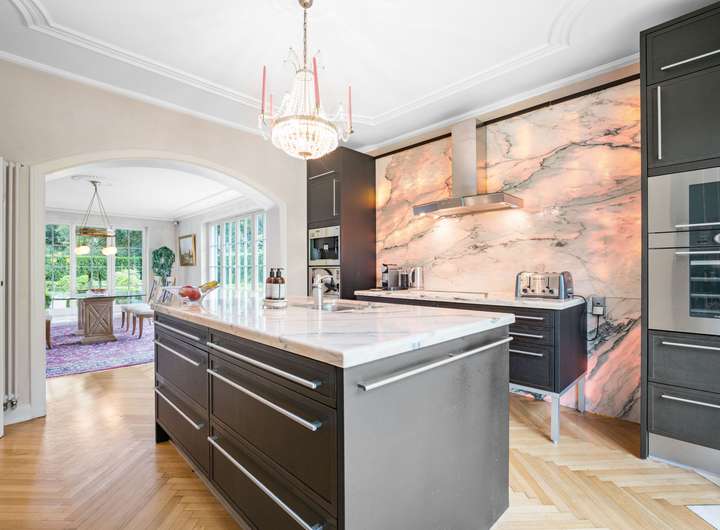 - hochwertige Küche mit Mielegeräten und beleuchtbarer Wandverkleidung aus Estremoz