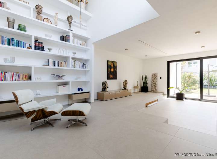 Auch im Inneren setzt sich die hochwertige Gestaltung fort: Großformatige Keramikfliesen aus Spanien und edles Echtholzparkett schaffen eine Atmosphäre von Eleganz und Beständigkeit. Eine maßgeschneiderte Einbauküche mit Dekton-Arbeitsplatte und Kochinsel bildet das Herzstück des Hauses. Italienische Leuchten, ein durchdachtes Smart-Home-System von Busch-Jaeger sowie eine vollständige Netzwerkverkabelung runden die Ausstattung auf höchstem Niveau ab.