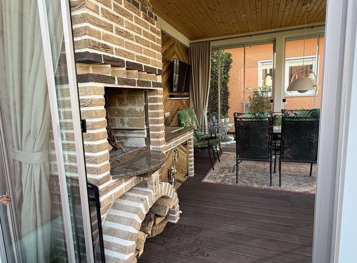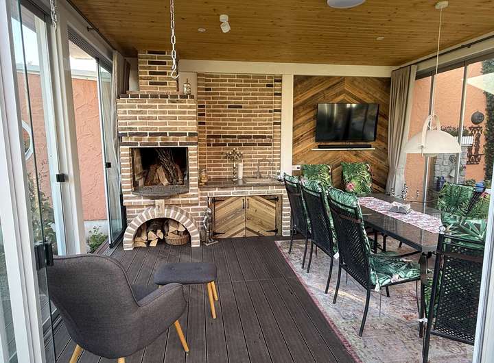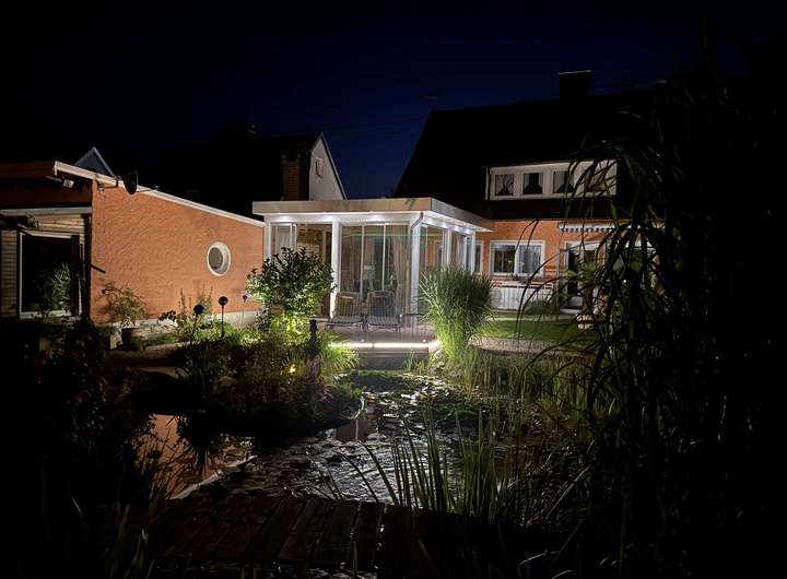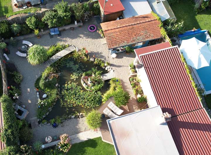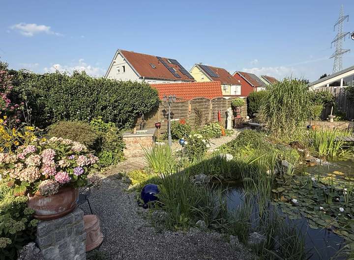 Kaminofen, Grundwasserbrunnen, Versickerungsregole für Regenwasser, Gartenteich, großer Freisitz mit Kamin, Doppelgarage