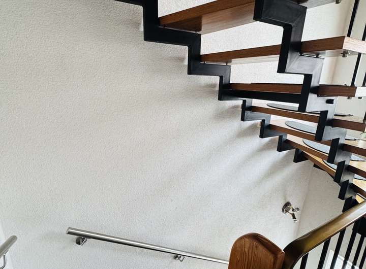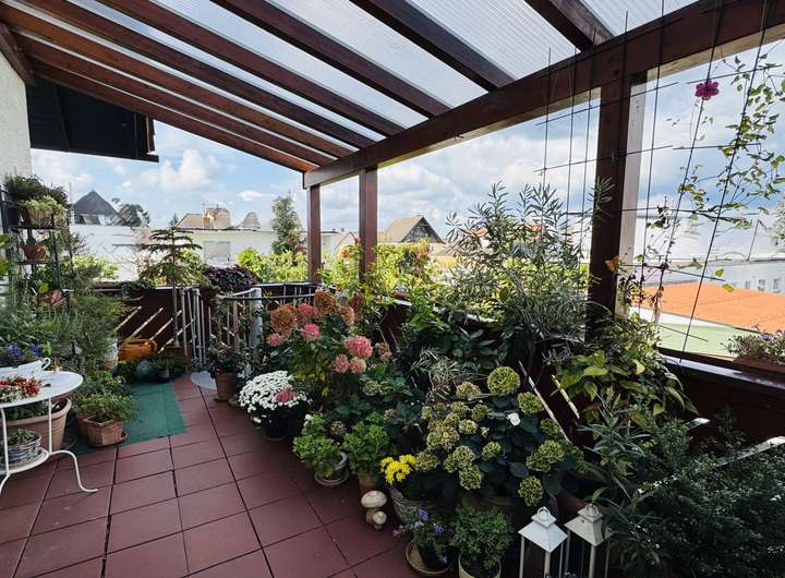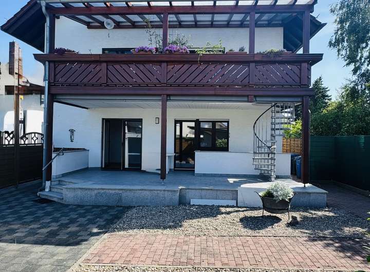 Ein besonderes Highlight ist der große, überdachte Balkon mit Holzgeländer mit dem direkten Zugang aus dem Wohnzimmer und aus der Küche. Über eine Außentreppe gelangt man zusätzlich direkt vom Hof auf den Balkon.