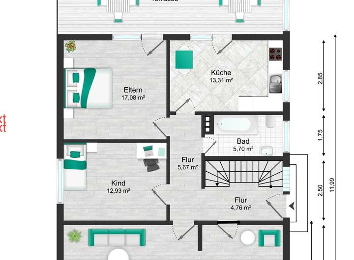 - Dachgeschoss (ca. 70 m²): vermietet, vollmöbliert