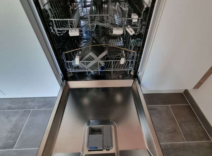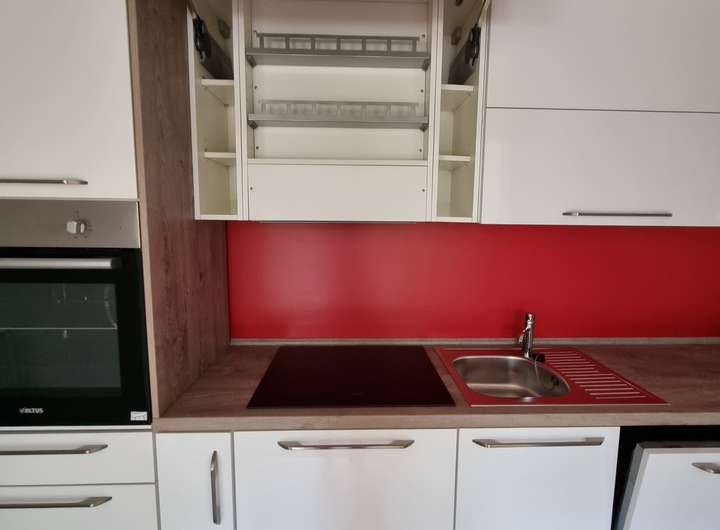 - moderne Einbauküche mit allen Geräten: Ceran-Kochfeld, Dunstabzug, Spülmaschine, Kühlschrank