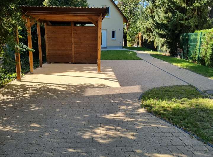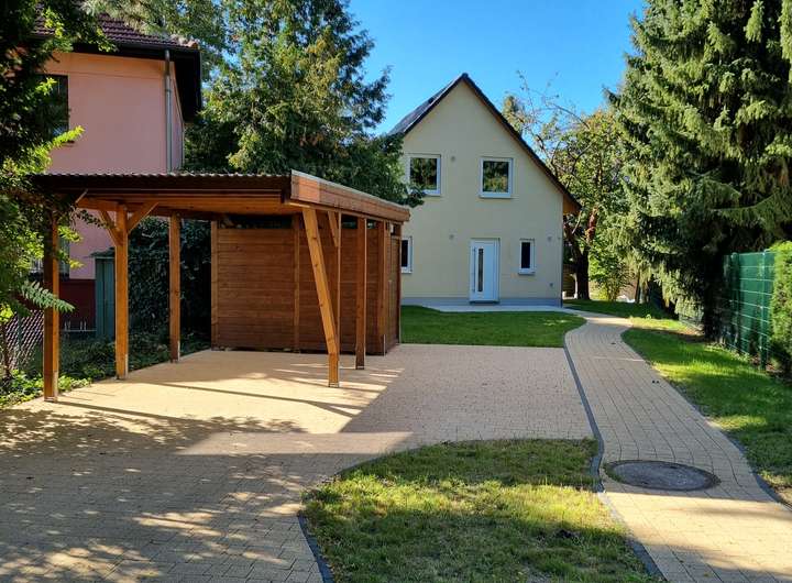 - Zwei Stellplätze, davon ein Carport mit integriertem Geräteschuppen