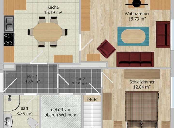2. Obergeschosswohnung, 50 m², mit Flur, Bad, Schlafzimmer, Kinderzimmer, Wohnzimmer und Küche sowie separater Dusche
