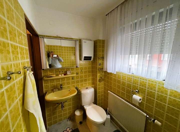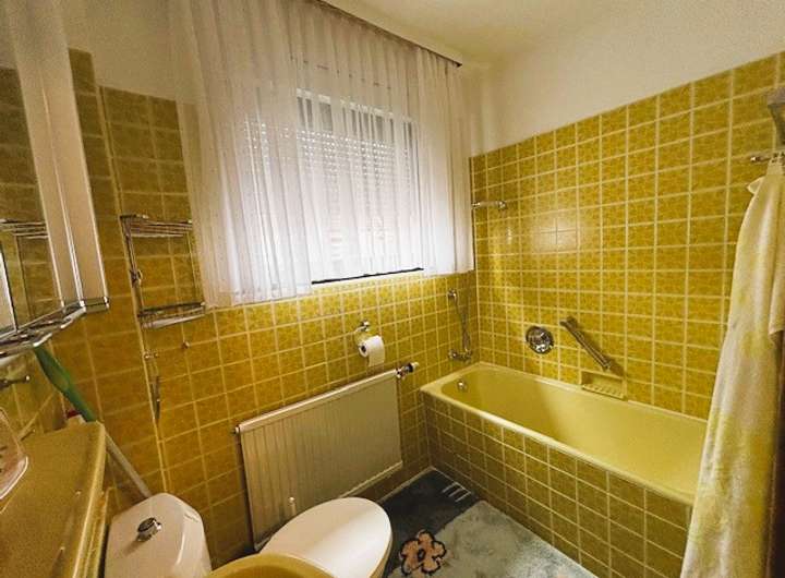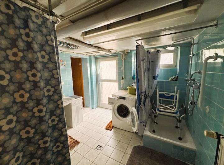 - Keller mit "Arbeits-Dusche" in der Waschküche, daneben Soutterain-Bad mit Fenster, Badewanne, Waschbecken und WC
