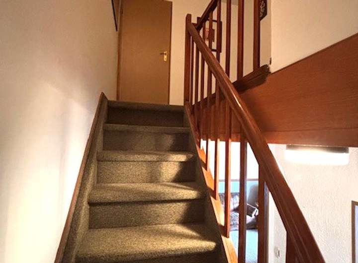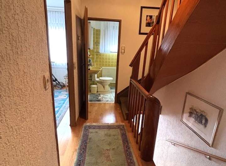 Eine schön gepflegte Holztreppe führt in das erste Obergeschoss, das aus