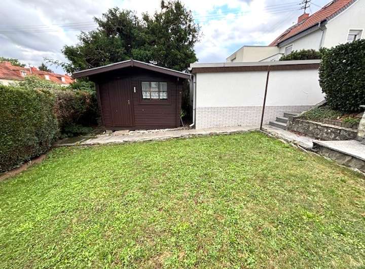 eine große Terrasse schließt sich an das Wohnzimmer an und ist auch direkt auf dessen Höhe gebaut. Deshalb gibt es eine elegante Steintreppe in den Garten, der um das nette Wiesengrundstück hohe blickschützende Sträucher besitzt. An der Seite hinter der Garage steht eine geräumige Holzhütte, die alle Gartenutensilien aufnehmen kann, so dass man nicht in den Keller gehen muss, auch wenn dieser leicht über eine Außentreppe zu erreichen ist. Angst vor Regenwasser braucht man bei dieser Kellertreppe nicht haben, da sie einen so hohen Absatz an der obersten Stufe hat, dass kein Wasser einfließen kann.