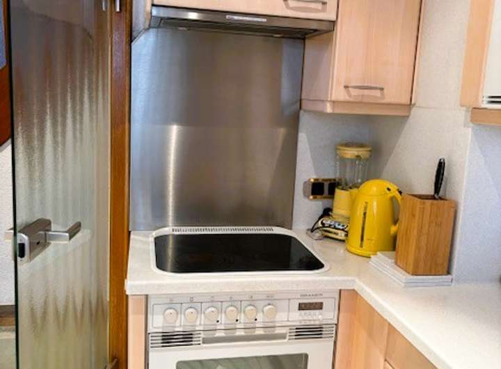 - perfekt eingepasste Küche mit heller holzfarbener Front und allem, was man in der Küche benötigt