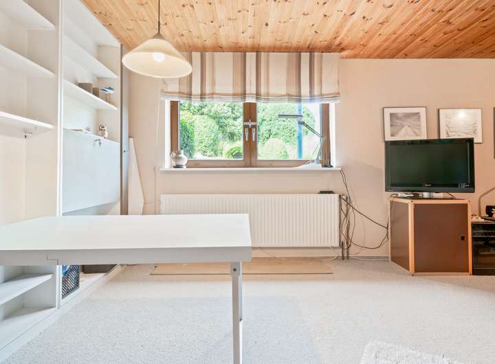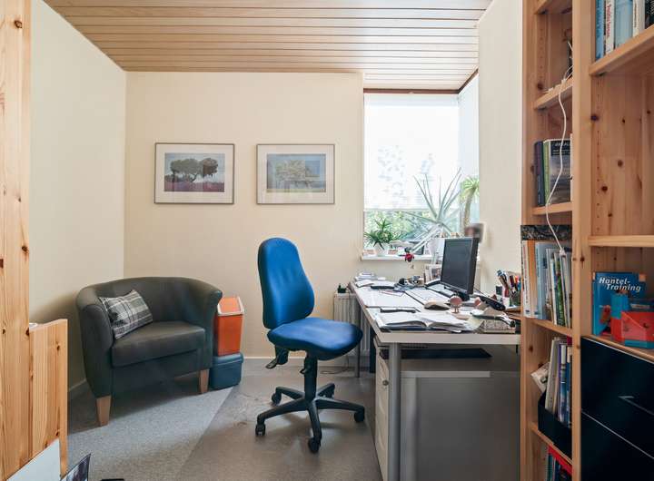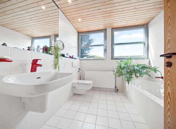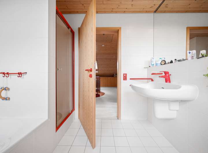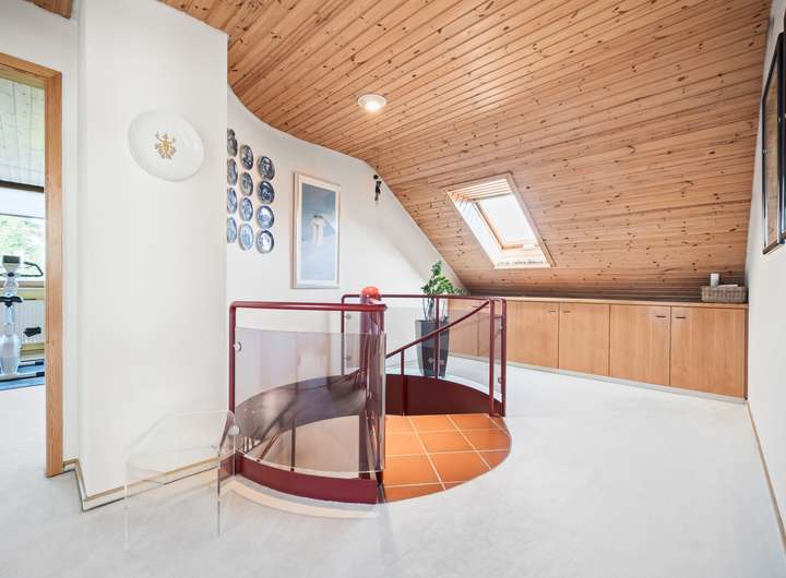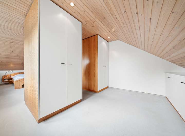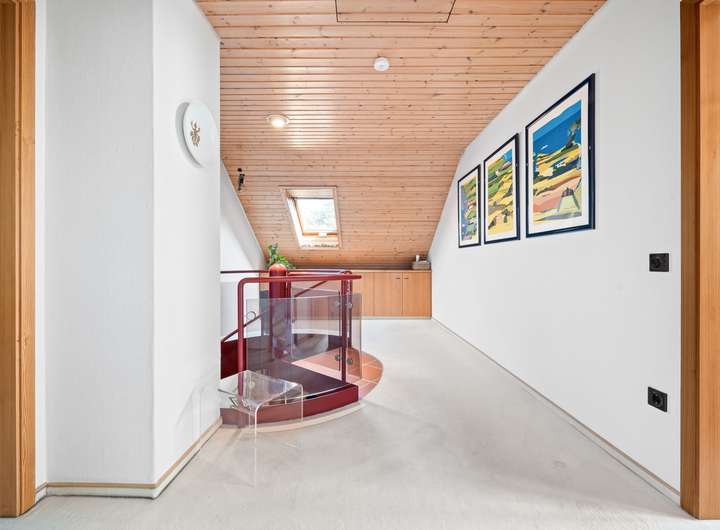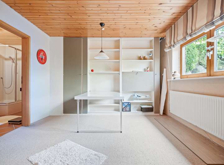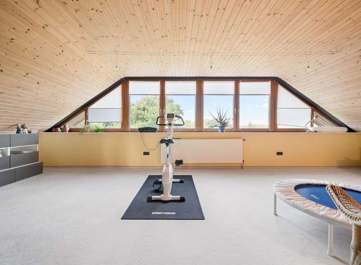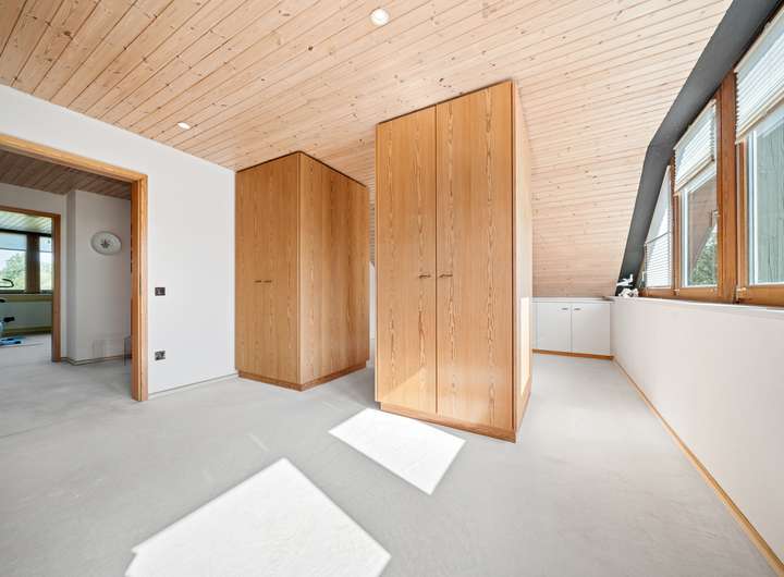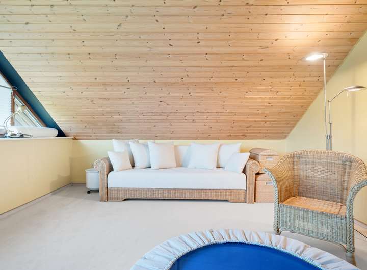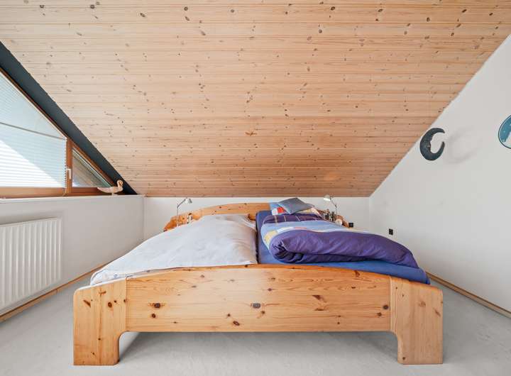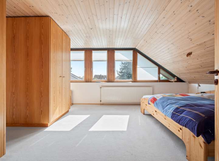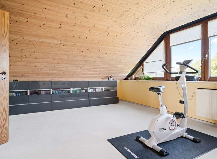 Der Schlafbereich bietet auf seinen rund 22 m2 ausreichend Raum für einen erholsamen Ruhebereich. Um die Fläche optimal zu nutzen, wurden mittig im Raum, die von beiden Seiten nutzbaren Kleiderschränke platziert, deren Stauraum ergänzt wird durch die praktischen Einbauschränke, die direkt in der Schräge ihren Platz gefunden haben. Durch die große Fensterfront ergibt sich eine lichte Wohlfühlatmosphäre. Das mit seinen rund 7 m2 großzügig gestaltete Bad verfügt über zwei Fenster in einer Gaube, helle Fliesen und eine warme Holzdecke. Mit der Badewanne und der Dusche verfügt dieses Bad über alle Optionen für einen gelungenen Start in den Tag. Das weitere, rund 22 m2 große, Zimmer im OG bietet ebenfalls eine große Fensterfront und eignet sich ideal für einen Kinder-, Gäste- oder Hobbybereich. Derzeit wird hier die Fitness gestärkt, denkbar wäre aber auch eine Aufteilung in zwei Zimmer, die sich dann ideal als Kinderzimmer anbieten würden.
