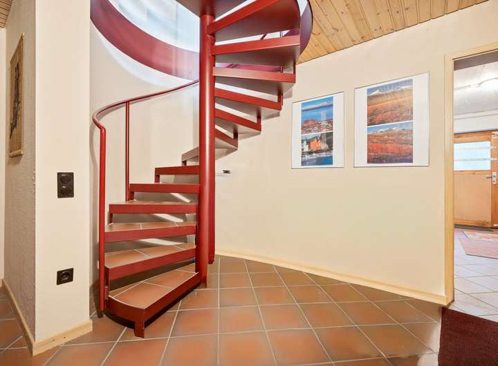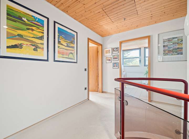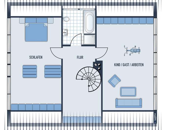 Über die Stahltreppe gelangen Sie in den Flur des OG, von dem Sie den Schlafbereich, das Bad und ein weiteres Zimmer direkt erreichen können. Der Flur bietet nicht nur ausreichend Raum für einen Einbauschrank in der Schräge, sondern würde zusätzlich die Gestaltung einer Leseecke erlauben.