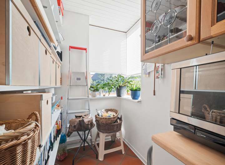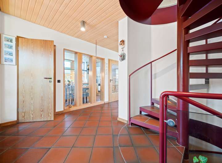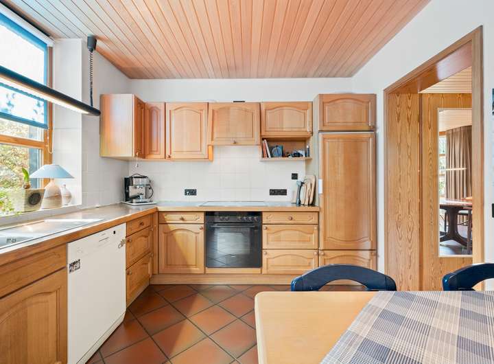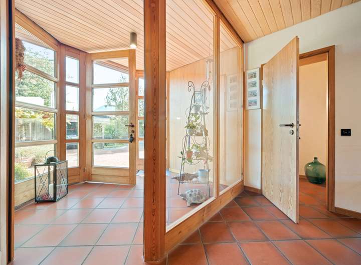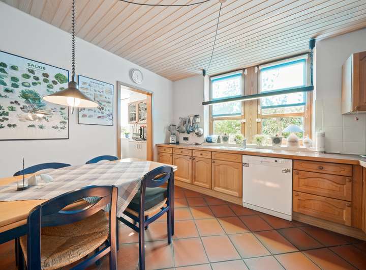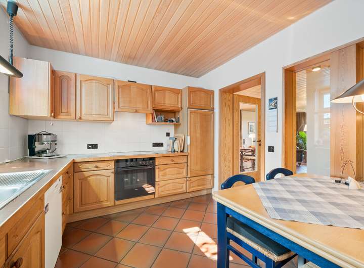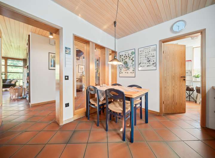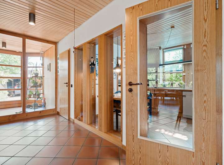 Der Flur des EG profitiert von den feststehenden Glaselementen, die einen direkten Blick in die Küche des Hauses erlauben und für zusätzliche Belichtung sorgen. Die Küche bietet auf rund 11 m2 eine Vollholzküchenzeile in L-Form und Platz für einen Essbereich, zwei Fenster und Zugang in einen Hauswirtschaftsraum.