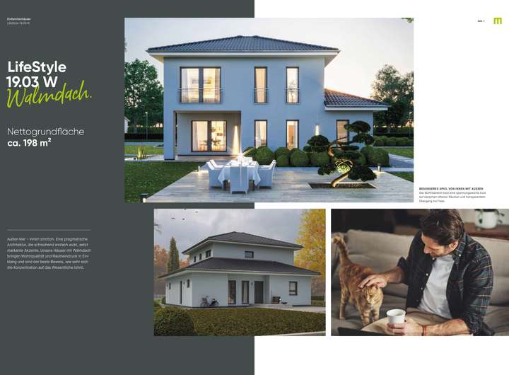 Mediterranes Flair und eine klare Formensprache – unser LifeStyle 19.03 W bietet auf einer Nettogrundfläche ab ca. 198 m² alles, was das Bauherrenherz begehrt. Die abgewalmte Eingangssituation mit traufseitig umlaufender Walmdachfortsetzung weckt toskanische Assoziationen, die großzügigen Grundrisse laden vom Keller bis zum Dach zur Verwirklichung individueller Wohnwünsche ein. Besonders gelungen ist dabei der versetzt angeordnete, großzügige Wohn-, Ess- und Küchenbereich – inklusive Direktzugang zur vorgelagerten Terrasse.