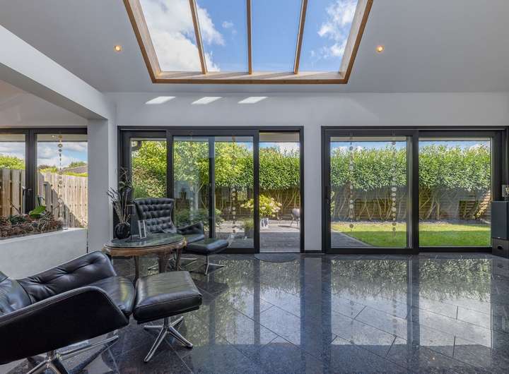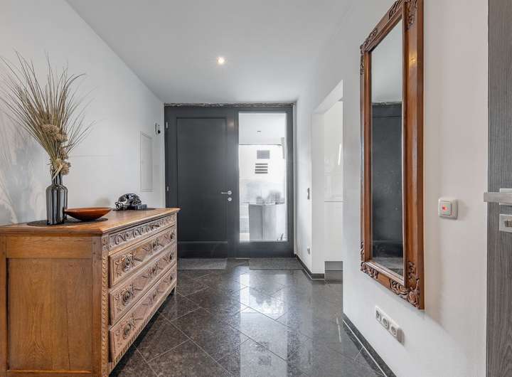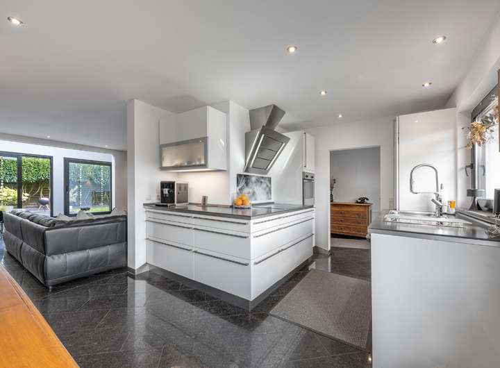 Dies zeigt sich beispielsweise an dem durchgehend verlegten dunklen Granitboden, der aufgrund seiner Härte und Dichte langlebig ist und sehr edel wirkt. Auch die kostenintensiven, großflächigen Hebe-Schiebeelemente als Terrassentüren überzeugen durch ihre Qualität und Leichtgängigkeit. Selbst die Dachrinnen und Fallrohre bestehen aus hochwertigem und langlebigem Kupfer und tragen zum Gesamtbild des Hauses bei.