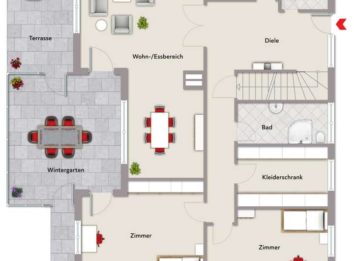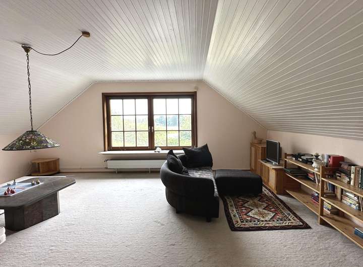 Im Erdgeschoss überzeugt der großzügige Wohn- und Essbereich mit angrenzender Küche und integrierter Durchreiche (optional eine offene Küche). Von hier aus gelangen Sie auf zwei Terrassen sowie in den lichtdurchfluteten Wintergarten mit Südausrichtung – ein Ort zum Entspannen und Genießen. Ergänzt wird diese Ebene durch zwei weitere Zimmer, eine Ankleide, ein Gäste-WC sowie ein modernes Duschbad mit Spots aus dem Jahr 2014. Das Dachgeschoss umfasst zwei große Zimmer, ein Wannenbad sowie ein weiteres Duschbad und bietet damit großzügige Rückzugsbereiche für die ganze Familie.