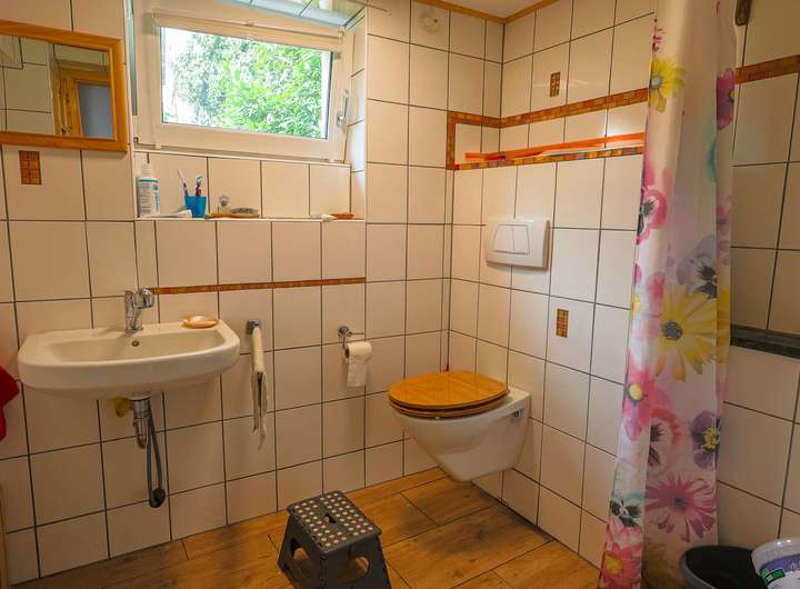 Die Einliegerwohnung umfasst rund 60m² Wohnfläche. Der offene Wohn-Ess-Bereich mit abgetrenntem Schlafbereich schafft ein modernes Ambiente. Das Badezimmer mit bodentiefer Dusche wurde vor knapp 10 Jahren erneuert und befindet sich auf dem Flur direkt neben der Wohnung.