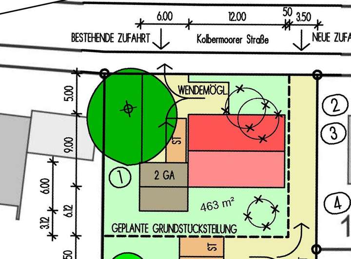 Bisher ist die Größe dieses Grundstücks aufgrund des Bewuchses durch eine große Buche und 3 Fichten nicht einschätzbar. Während die Buche im derzeitigen Zustand zu erhalten ist dürfen die 3 Fichten auf diesem Grundstück gefällt werden.