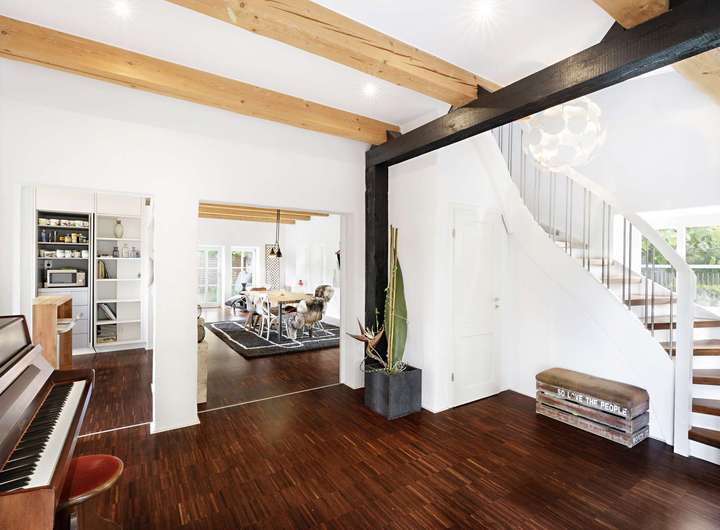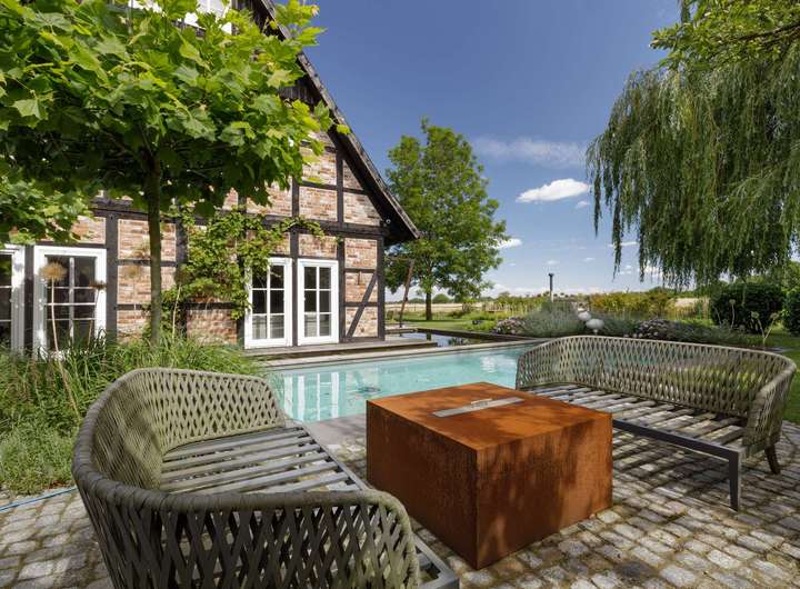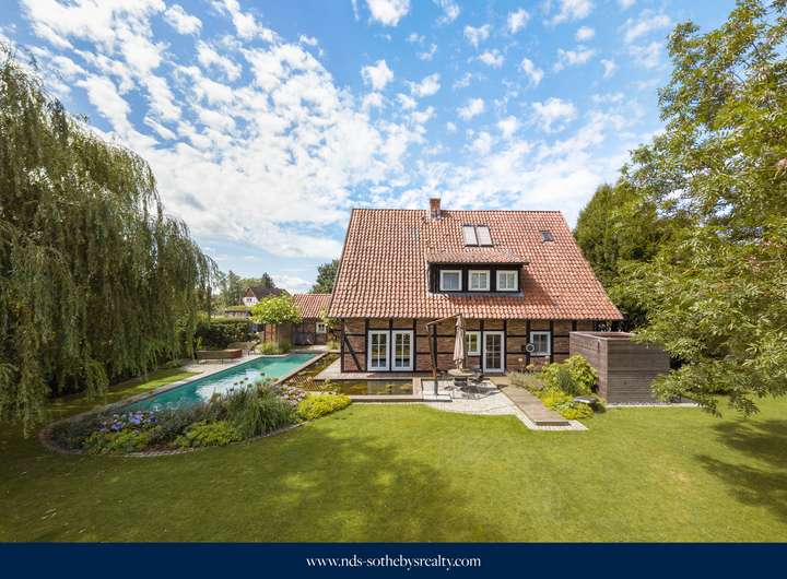 Das exklusive, ca. im Jahr 2000 wiederaufgebaute und technisch modernisierte Fachwerkhaus bietet mit seiner hochwertigen, von einer sehr bekannten Isernhägener Tischlerei gefertigten Innenausstattung und dem familienfreundlichen Grundriss eine Symbiose aus modernem Wohnkomfort und traditioneller Bauweise. Ein traumhafter, von einem renommierten Landschaftsgärtner gestalteter Garten mit Pool, Jacuzzi, Seerosenbecken, Terrassen und Outdoor-Küche in direkter Feldrandlage nahe des Landschaftsschutzgebietes ergänzt das luxuriöse Ambiente harmonisch und bietet eine unvergleichliche Lebensqualität. Der großzügige, offen gestaltete und dank teilweise bodentiefer Fensterelemente lichtdurchflutete Wohn-und Essbereich bietet einen wunderbaren Blick und Zugang zum Garten sowie durch einen Wanddurchbruch zur Küche. Diese verfügt über eine Tischler-Einbauküche mit Gaggenau-Elektrogeräten, Grohe-Heißwasserbereitung und einem Küchenblock mit bequemer Tresenlösung. Der angrenzende Hauswirtschaftsraum mit Einbauschränken und Entkalkungsanlage bietet Platz für eine Waschmaschine und ausreichende Abstellfläche. Über eine Eichenholztreppe im einladenden Eingangsbereich mit Gäste-WC gelangt man in das Obergeschoss. Hier befindet sich das klimatisierte Eltern-Schlafzimmer mit einem separaten Ankleidebereich und einem sehr stilvollen, modernen en suite Badezimmer. Dieses verfügt über eine freistehende Badewanne, eine bodentiefe Dusche, eine separate Toilette und einen Doppelwaschtisch. Das Obergeschoss bietet darüber hinaus noch zwei weitere Zimmer, die vielseitig genutzt werden können, beispielsweise als Kinder- oder Arbeitszimmer. Eine freistehende Treppe führt vom Obergeschoss in das ausgebaute Dachgeschoss, welches nicht in der Wohnflächenberechnung enthalten ist. Ein klimatisierter Raum, der aktuell als Jugendzimmer genutzt wird, kann als großzügiges Büro oder als Hobby-/Fitnessbereich verwendet werden. Ein Duschbad, ein Flur mit diversen Einbaumöbeln und der Heizungsraum runden das Platzangebot in dieser Etage ab. Ein Nebengebäude mit einem Wohn-/Schlafzimmer, einem Duschbad, einer kleinen Küche sowie einer Sauna dient als Wellness-/Fitnessbereich oder als separates Gästehaus. Ein Highlight dieses außergewöhnlichen Objektes ist der 2022 komplett neu gestaltete, pflegeleicht angelegte Garten mit einem über eine Wärmepumpe beheizbaren, beleuchteten Pool (ca. 10 m x 5 m x 1,70 m), Seerosenbecken, Hot Tub, drei Terrassen und einem wunderbarem Blick in das Landschaftsschutzgebiet sowie auf die Marienkirche von Isernhagen KB. Die smarte Außenbeleuchtung, ein modernes Gerätehaus, ein Schuppen für die Schwimmbadtechnik und zwei Außenstellplätze mit Wallbox runden dieses einzigartige Angebot ab. Lassen Sie sich vom Charme, Luxus und Wohlfühlerlebnis dieser Immobilie anlässlich einer Besichtigung überzeugen.