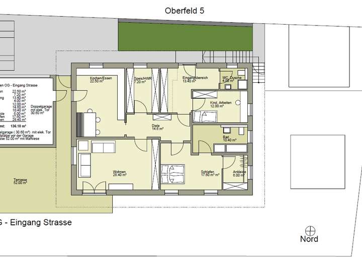 Die obere Wohneinheit verfügt über ca. 136 m² Wohnfläche mit Wohnzimmer, Essbereich, Küche mit Speis, Schlafzimmer mit Ankleide, Kinder-/Arbeitszimmer, Bad, Gäste-WC mit Dusche und Diele. Die ca. 52 m² große Terrasse mit Markise sowie eine Doppelgarage mit elektrischem Tor und zwei weitere Stellplätze bieten höchsten Komfort. Diese Wohnung ist frei verfügbar.