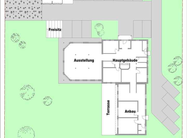 * Fenster/Beschattung: Kunststofffenster | manuelle Rollläden (Hauptgebäude), teils Raffstores mit Funksteuerung (Ausstellung), elektrische Raffstores (Anbau)