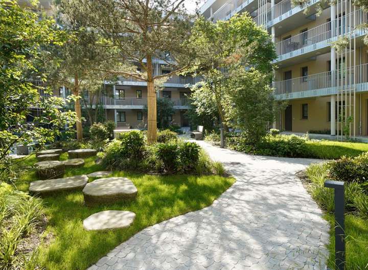 * Modernes Neubau-Quartier, weitgehend autofrei