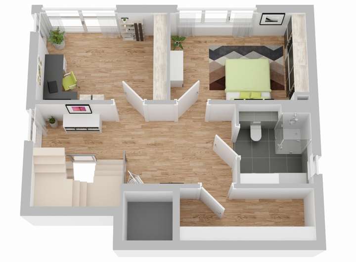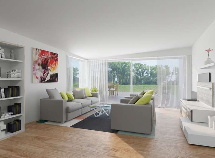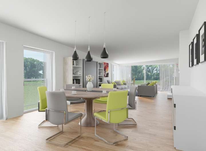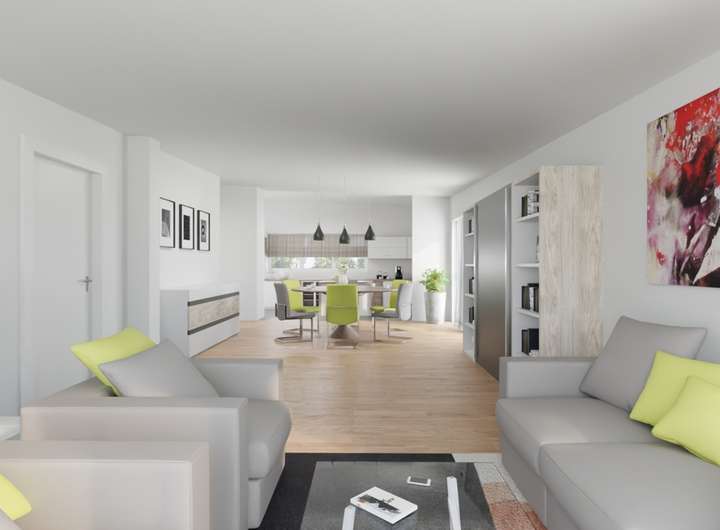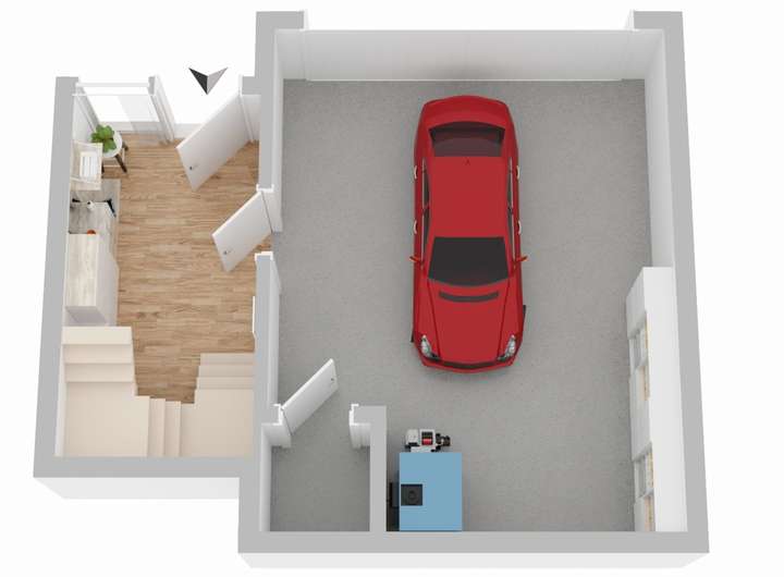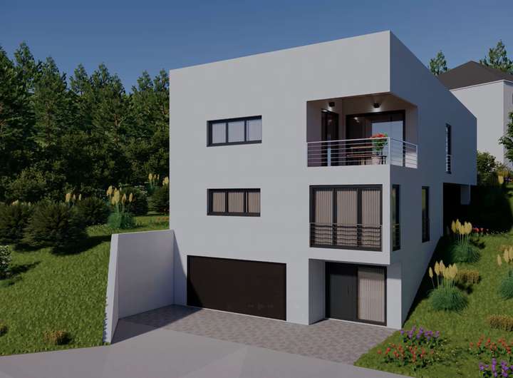 Die Wohnfläche erstreckt sich über 2 Etagen. Die unterste Etage ist laut Planung mit einer Garage versehen.