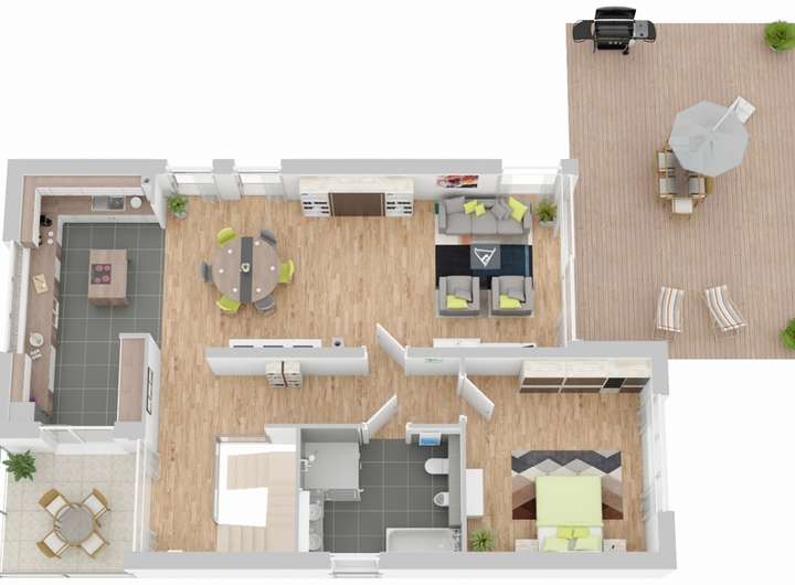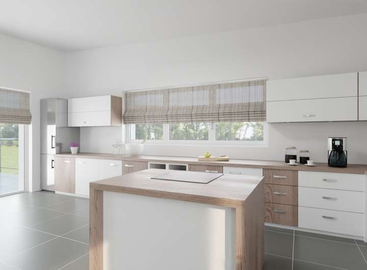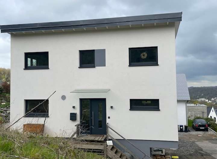 Großen Außenflächen mit wunderbarem Blick Richtung Tal sorgen für das besondere Extra ebenso wie die im obersten Geschoss besondere Raumhöhe von 4 Metern im offenen Wohn-Küchenbereich.