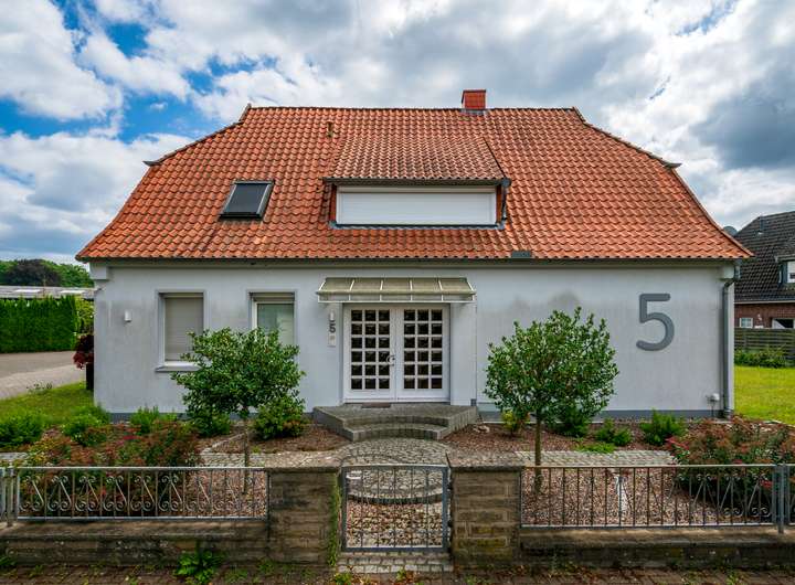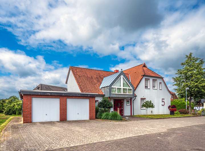 Das Grundstück umfasst 1.410 m² und bietet neben dem Haus eine Doppelgarage mit Abstellraum, mehrere PKW-Stellplätze sowie eine großzügige Südterrasse. Der Garten ist pflegeleicht mit Rasenflächen und Sträuchern gestaltet und mit einem Bewässerungssystem ausgestattet.